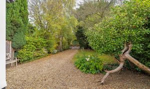 Outside, the secluded rear garden is mainly to lawn, has a sylvan setting with well established trees and shrubs, has a patio seating area and overlooks further woodland. To the front there is a gravel driveway for numerous cars, attractive garden and flower beds.