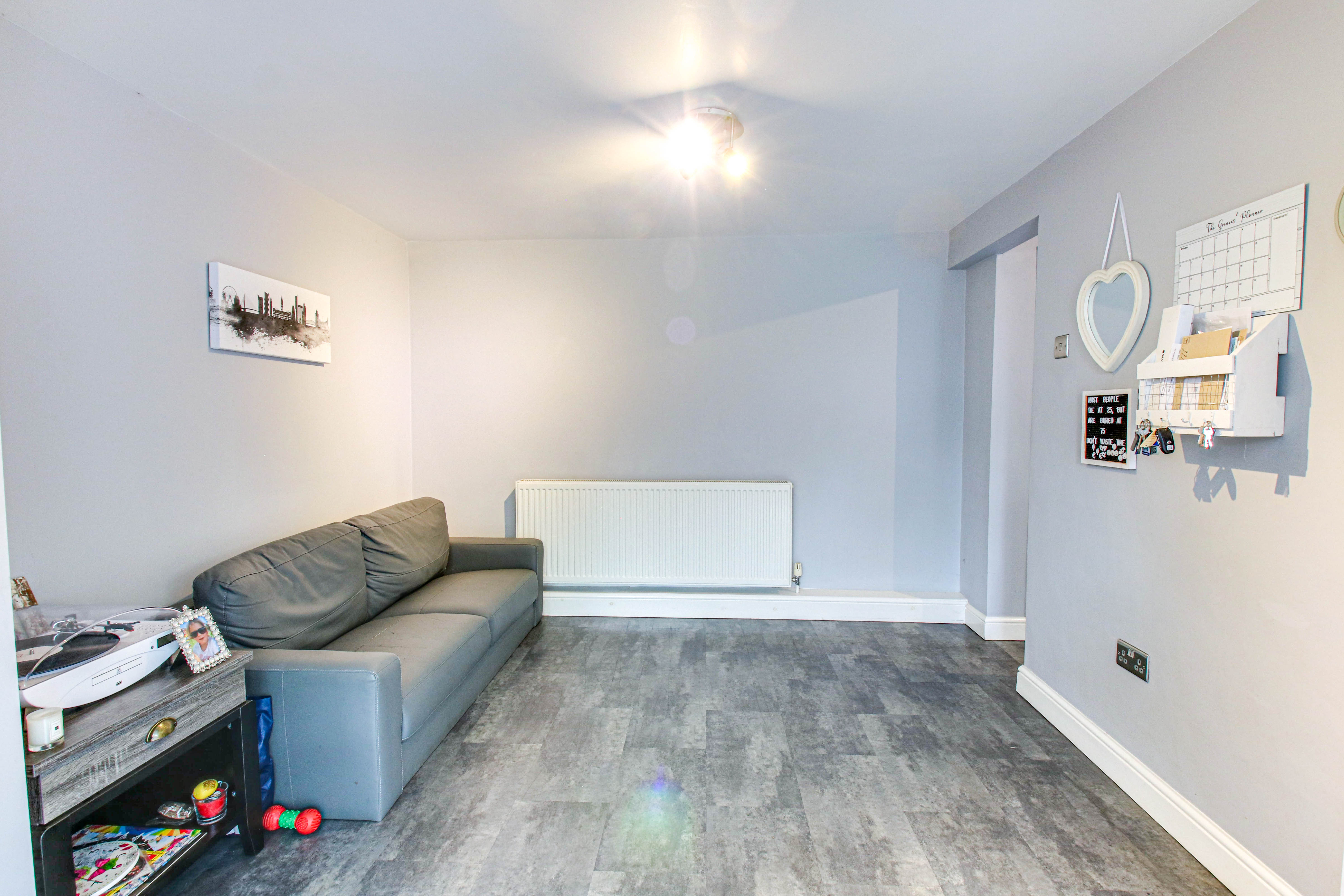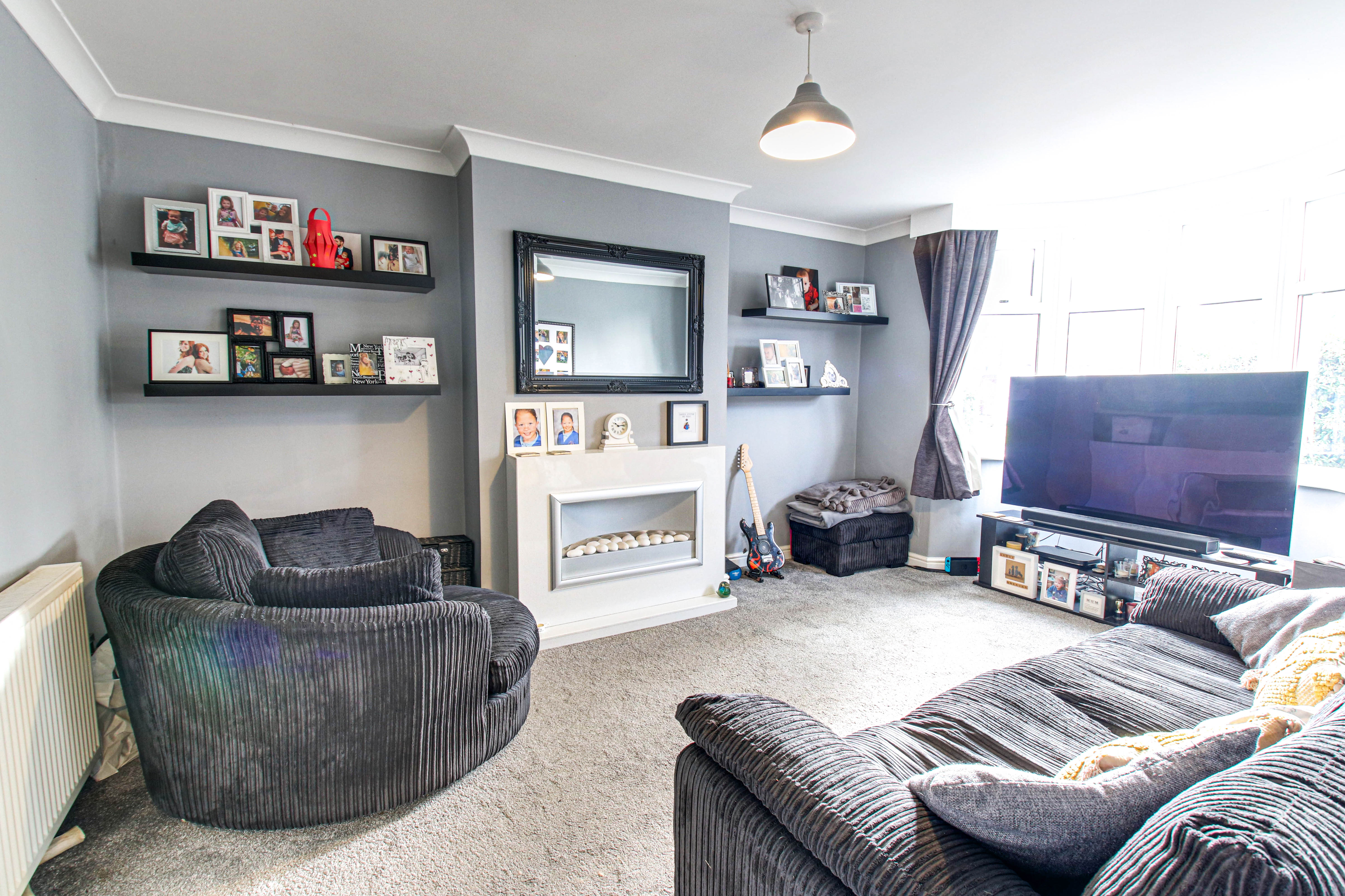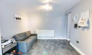 Front facing upvc bow window, laminate flooring, coving and radiator. *Measurement into the bay