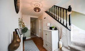 The rear garden is wonderfully private, mainly laid to lawn with a patio area ideal for outdoor dining, and framed by mature shrubs and trees. A storage shed is also included. To the front, a block-paved driveway provides ample off-road parking.