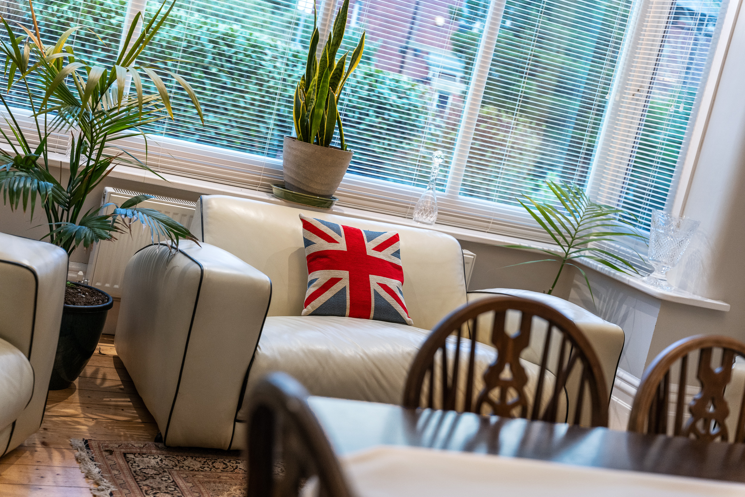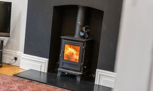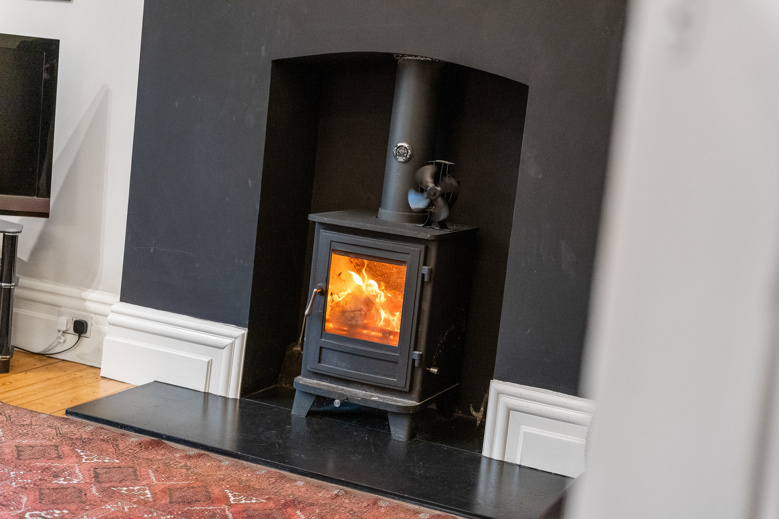 The main living room provides a warm and inviting retreat, arranged around a wood-burning and coal stove installed by Burning Desires of Preston, which sits within a dark-toned fireplace recess and creates a cosy focal point for evenings in. Original floorboards run beneath soft furnishings, while the bay window frames the outlook to the front, allowing daylight to pour in throughout the day and accentuate the generous proportions of the room.