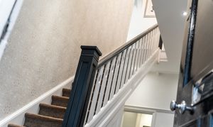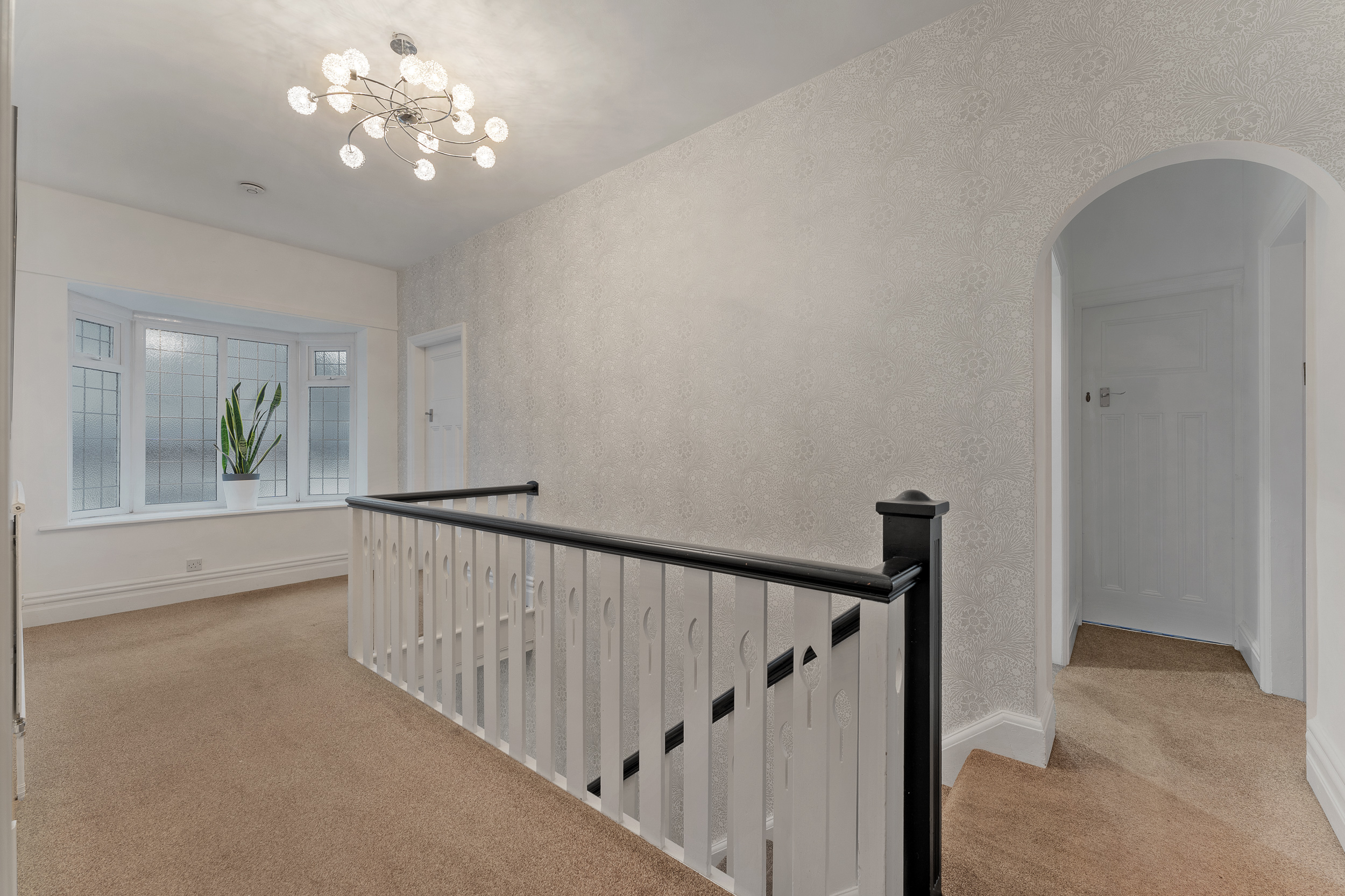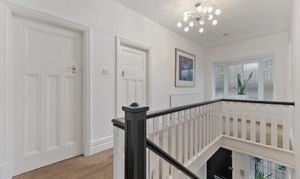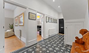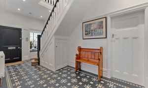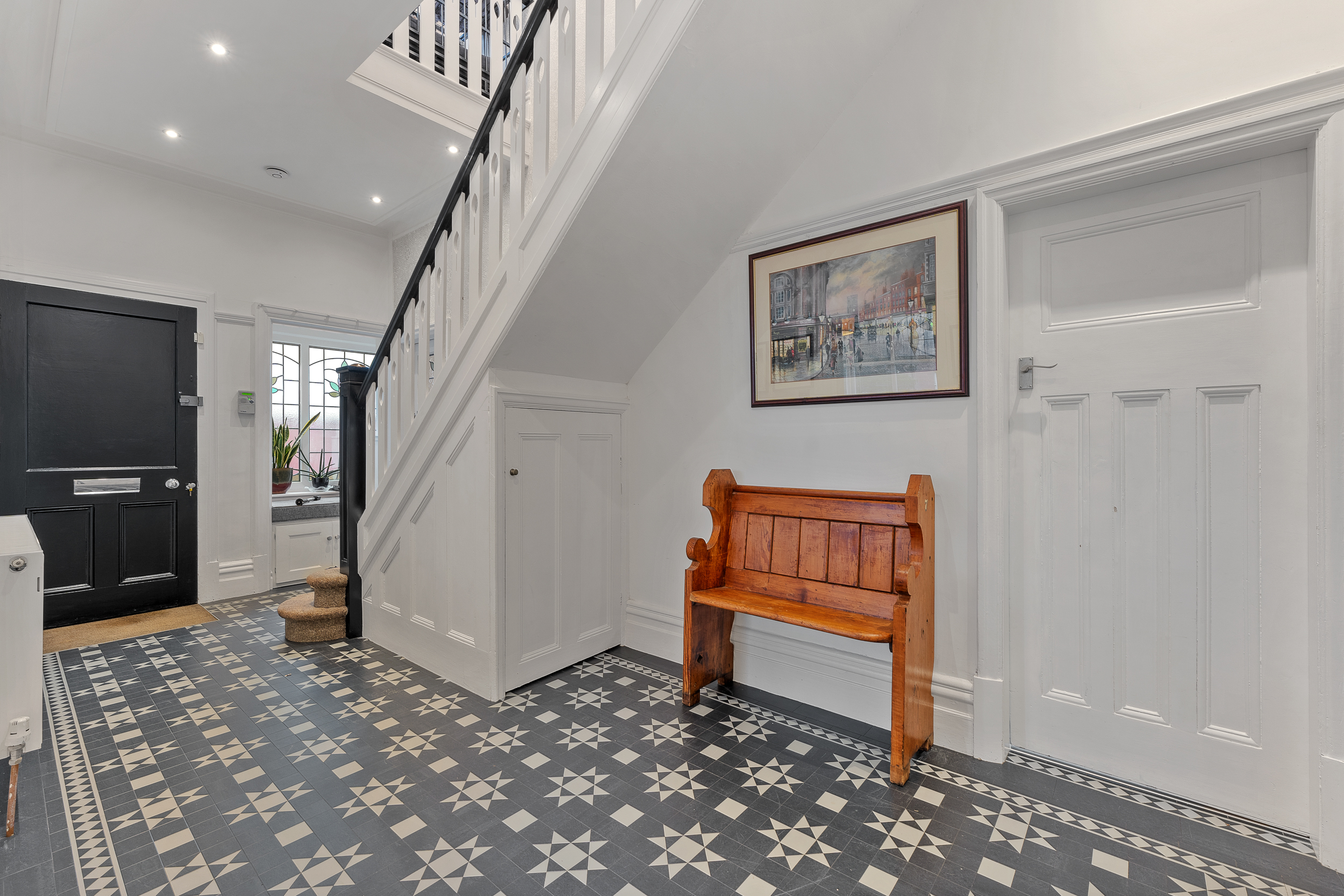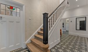 Underfoot, the patterned Amtico LVT floor makes an immediate statement, complementing the crisp white panelling and enhancing the sense of craftsmanship and symmetry. A staircase rises gracefully from the hall, finished with a carpeted runner and painted balustrade, drawing the eye upward and reinforcing the generous proportions of the space. Additional stained-glass door lights and traditional internal doors lead off the hallway, while thoughtful details such as the original joinery, deep skirting boards and period features combine to create a welcoming yet impressive introduction to the home.