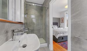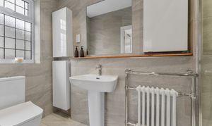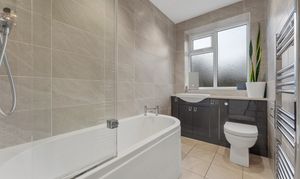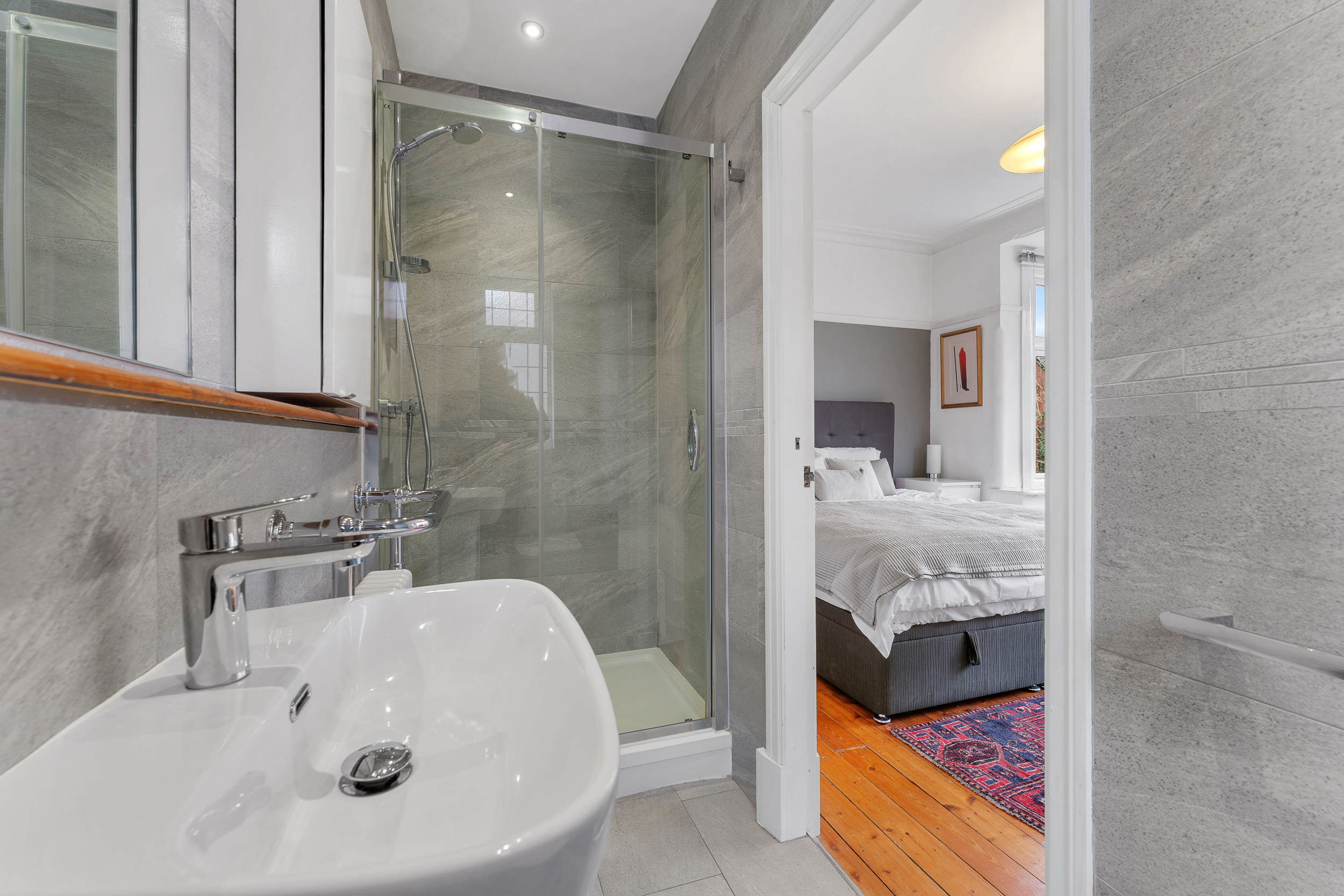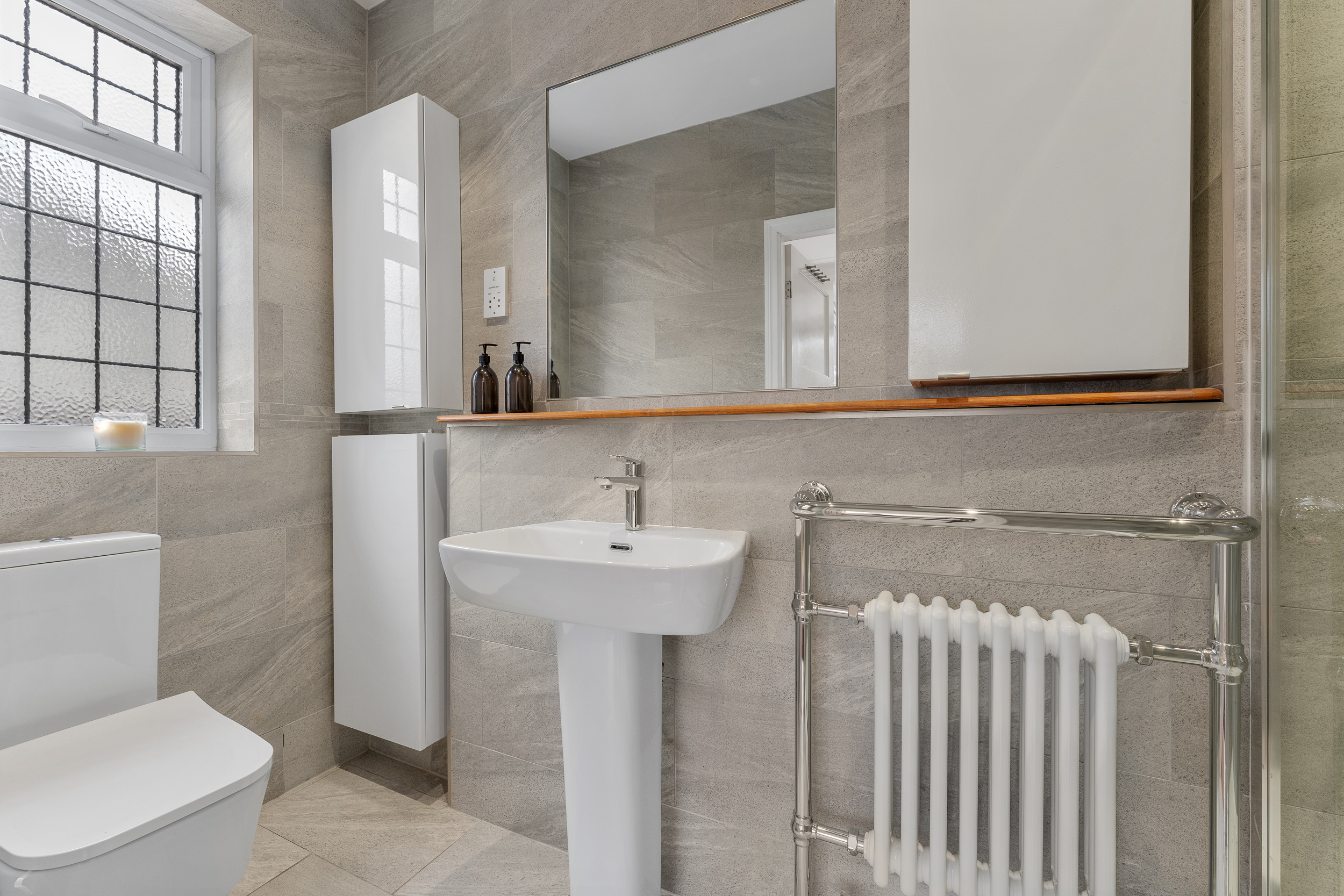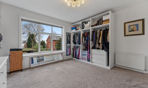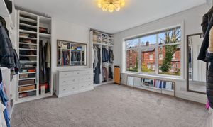 One of the bedrooms is currently arranged as a dressing room, fitted with extensive open shelving and storage, but remains a full and versatile bedroom in its own right. The principal bedroom is served by a smart en-suite shower room, while the remaining bedrooms are supported by a well-appointed family bathroom, both finished to a consistently high standard with quality fittings and materials. The family bathroom also features a full-sized bath with shower over, creating a practical and comfortable space for everyday use. A separate WC is also located on this floor, providing additional convenience for family living and guests.