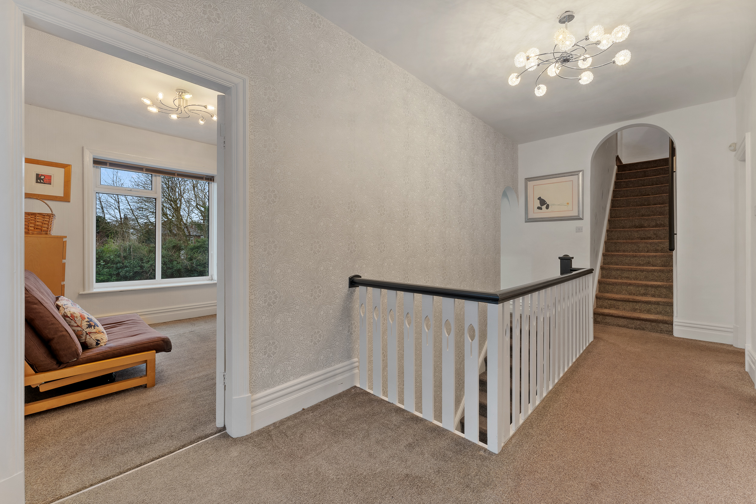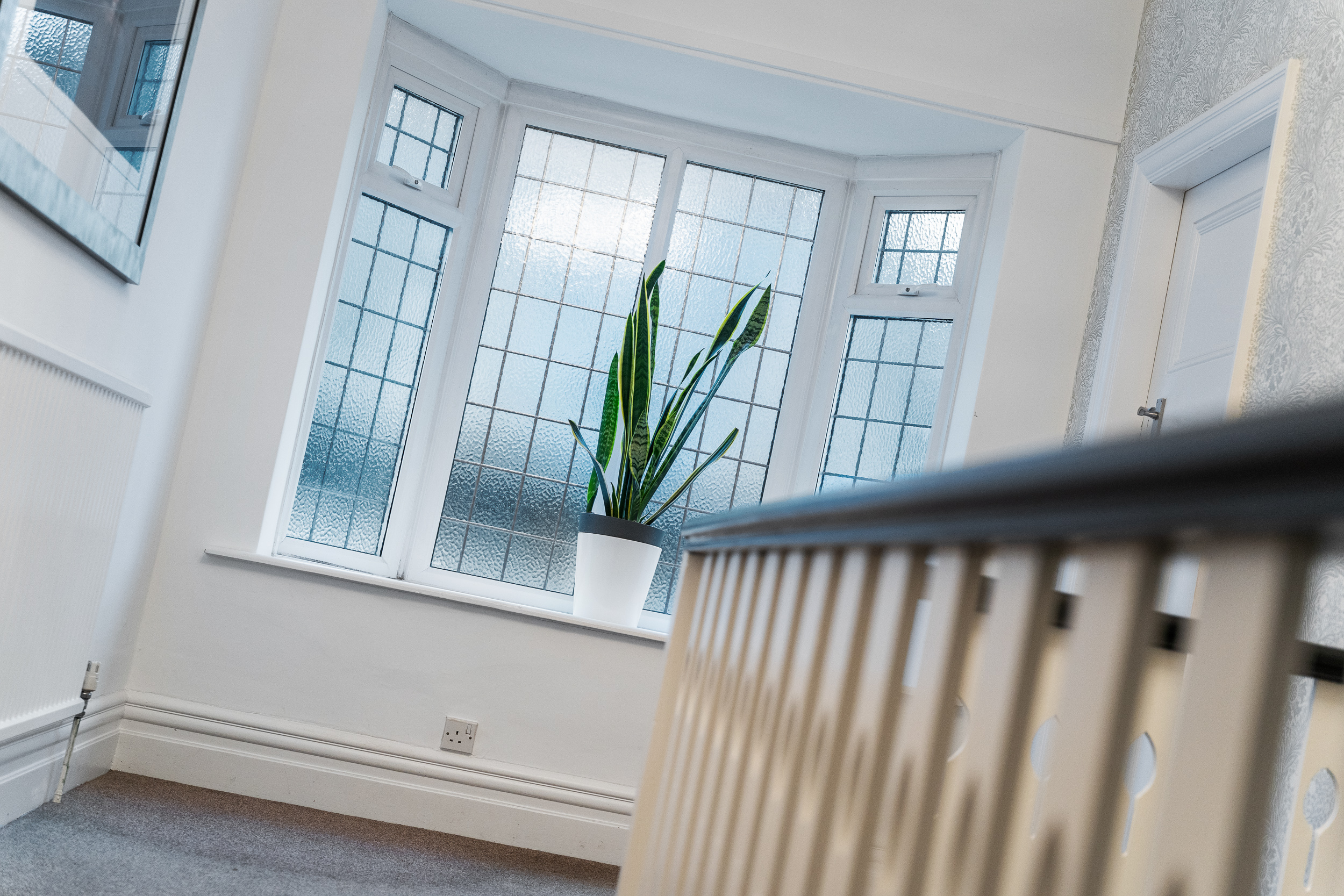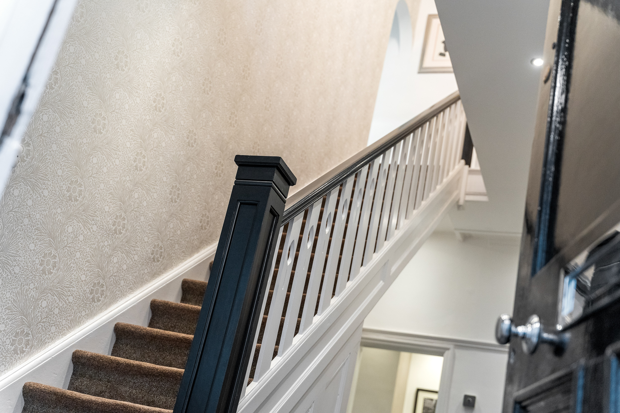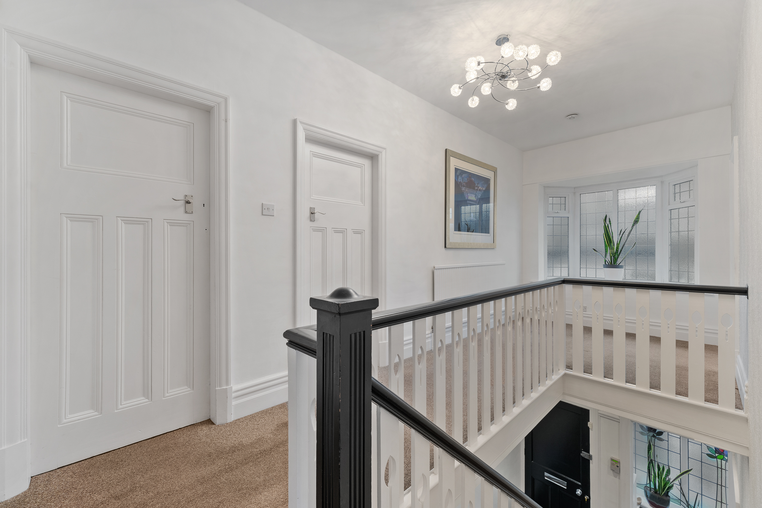 The staircase rises to the first floor, arriving at a bright and spacious central landing where natural light is drawn deep into the house via an elegant stained-glass window on the half landing, a feature that reflects the home’s period heritage and immediately sets the tone for the accommodation above.