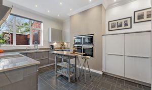 A large rear window sits above the sink, drawing in natural light and offering views to the garden, while the layout provides excellent storage and preparation space. The kitchen is exceptionally well equipped, featuring a comprehensive range of integrated appliances including Siemens ovens and steamer, a Bosch dishwasher installed in 2025, Liebherr fridge and freezer, a Siemens induction hob with Rangemaster extractor, and a Quooker Pro3 Nordic boiling-water tap fitted in 2024. A freestanding island unit adds further workspace and flexibility, easily repositioned to suit different needs, whether for informal dining, preparation or entertaining.
