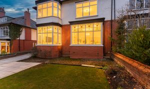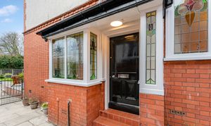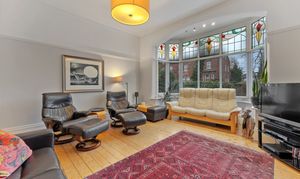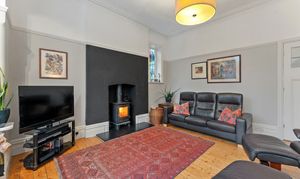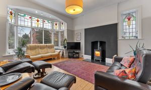 Approached from Albert Road, the property immediately presents a sense of scale and period elegance, set back behind a low brick boundary wall with a paved driveway providing valuable off-road parking. The driveway runs alongside the house, offering further access to the rear and additional parking beyond, a rare and practical feature for a home of this style and era. Step through the front door into a striking entrance hallway where high ceilings, original coving and beautifully re-leaded stained-glass panels set the tone for the accommodation beyond. Encapsulated within hardwood double-glazed windows to the front and side, the stained glass allows natural light to flood the space while preserving the home’s historic character.