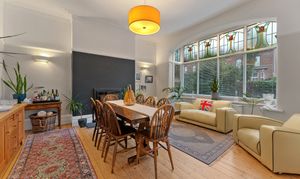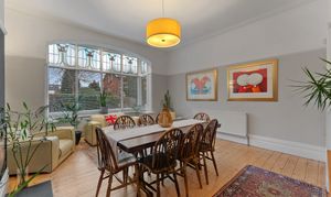 Opposite, the formal dining room mirrors the elegance and scale of the living room and is equally impressive. Once again, a large bay window with stained-glass detailing floods the space with light, making it an ideal setting for both everyday family meals and larger gatherings. A second stove adds warmth and atmosphere, while the depth of the room allows for a full dining table alongside additional seating, making it a sociable and versatile space for entertaining.