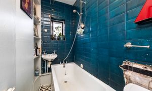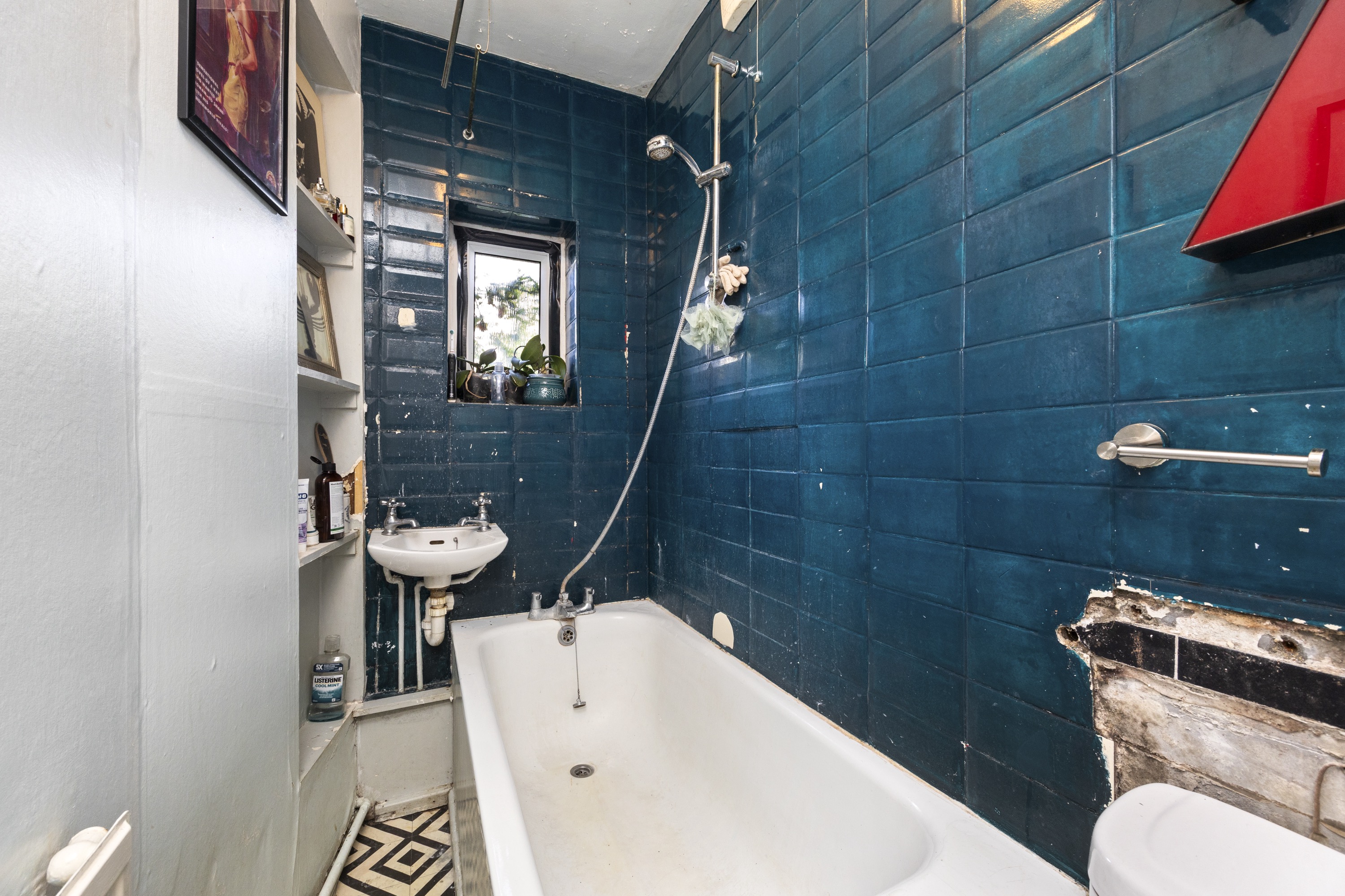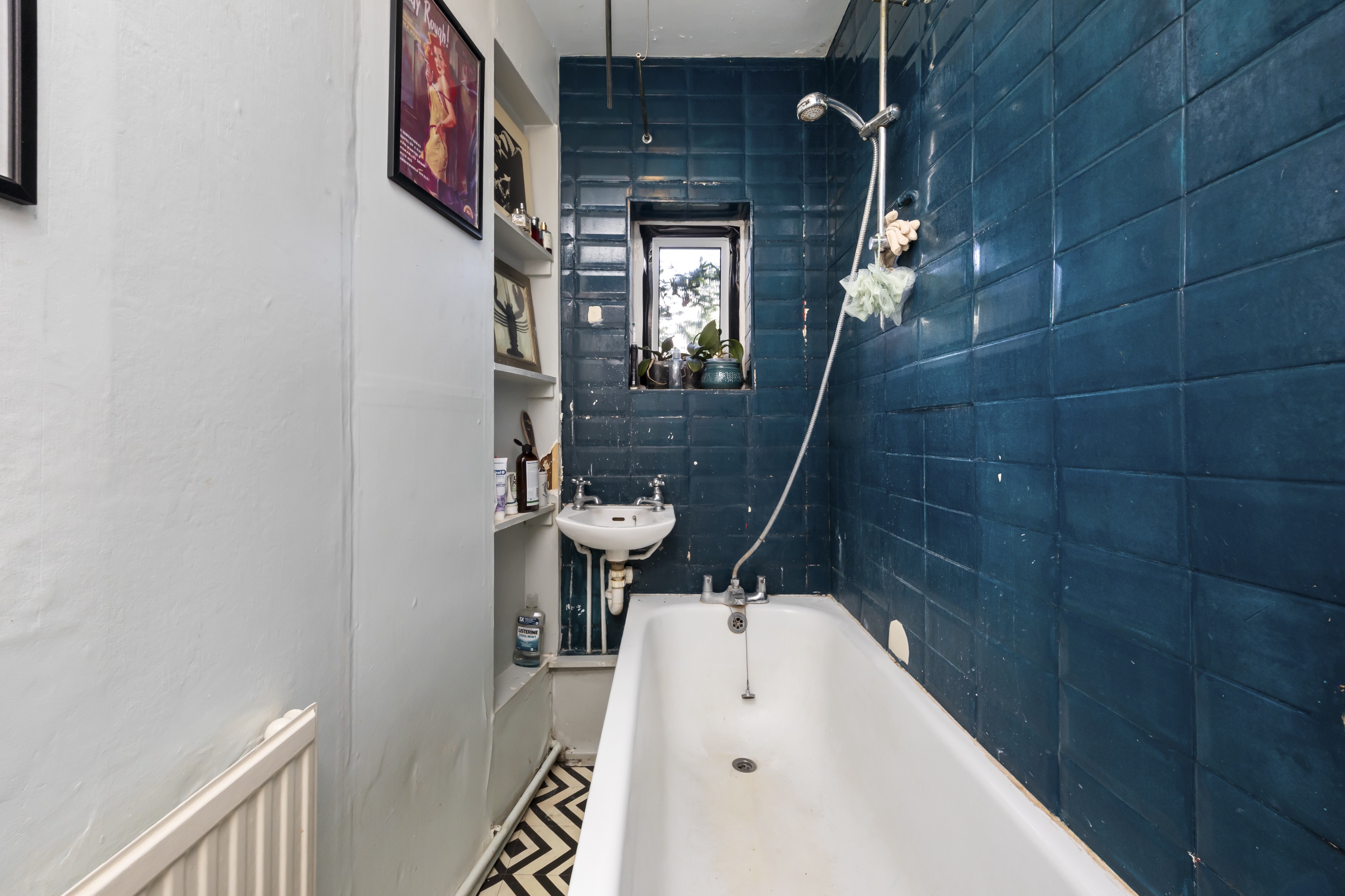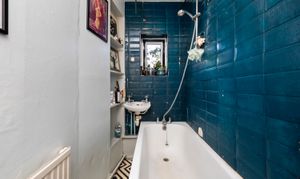 The property is serviced by a partially-tiled bathroom with a convenient shower overhead, ensuring practicality.