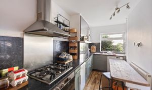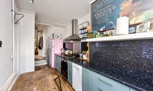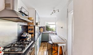 To the rear, the kitchen is well-equipped with ample wall and base units, plenty of countertop surface with a matching splash-back as well as space for white goods - all the while enjoying an attractive outlook over the rear garden.