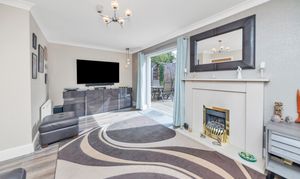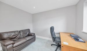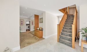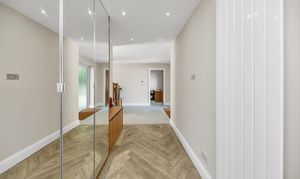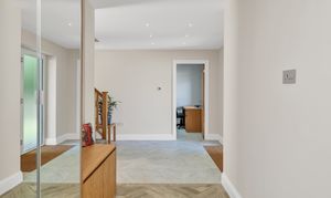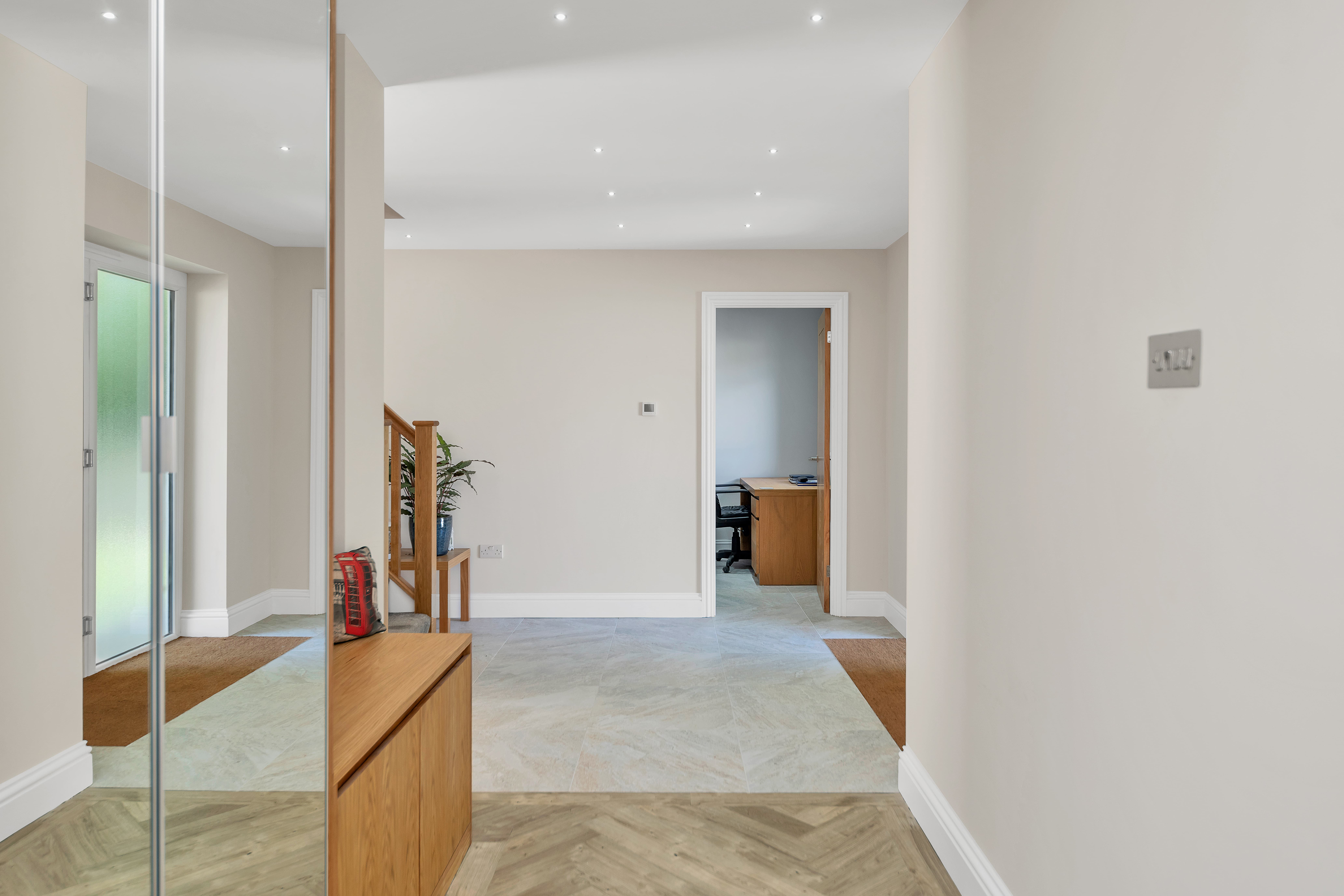 This lovely property enjoys a very generous frontage, with attractive raised borders and beds, full of plants and shrubs, a raised lawn, steps leading up to the front door, and a large block-paved driveway. Upon stepping inside, the entrance hallway is bright, wide and beautifully decorated, alluding to the high standard seen throughout. It enjoys tiled and Amtico parquet flooring, inset lighting, vast amounts of room for furniture, integrated storage, underfloor heating, stairs to the first floor, and doors through to the downstairs living space, including a large study.