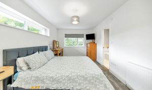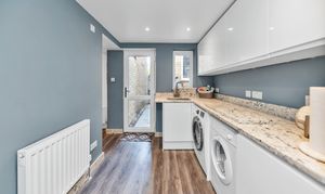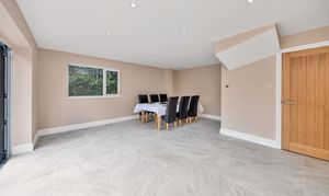 The living/dining room is an incredibly large space, with bi-fold doors leading out onto the garden terrace and making it a fantastic entertaining room. It enjoys neutral decor, tiled flooring, inset lighting and huge amounts of room for furniture. The lounge is equally an incredible size, benefiting from double French doors into the garden, wood flooring, stylish decor, pendant lighting, underfloor heating and ample space for a variety of lounge furniture.