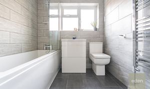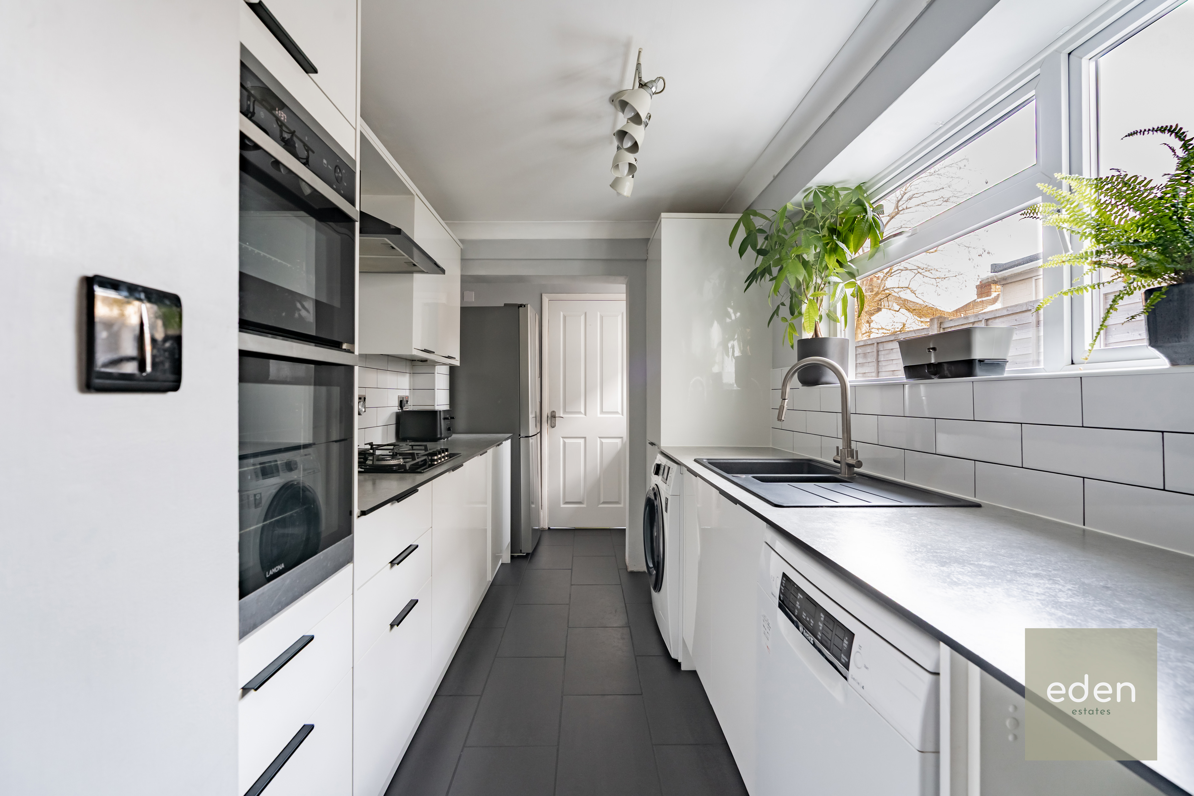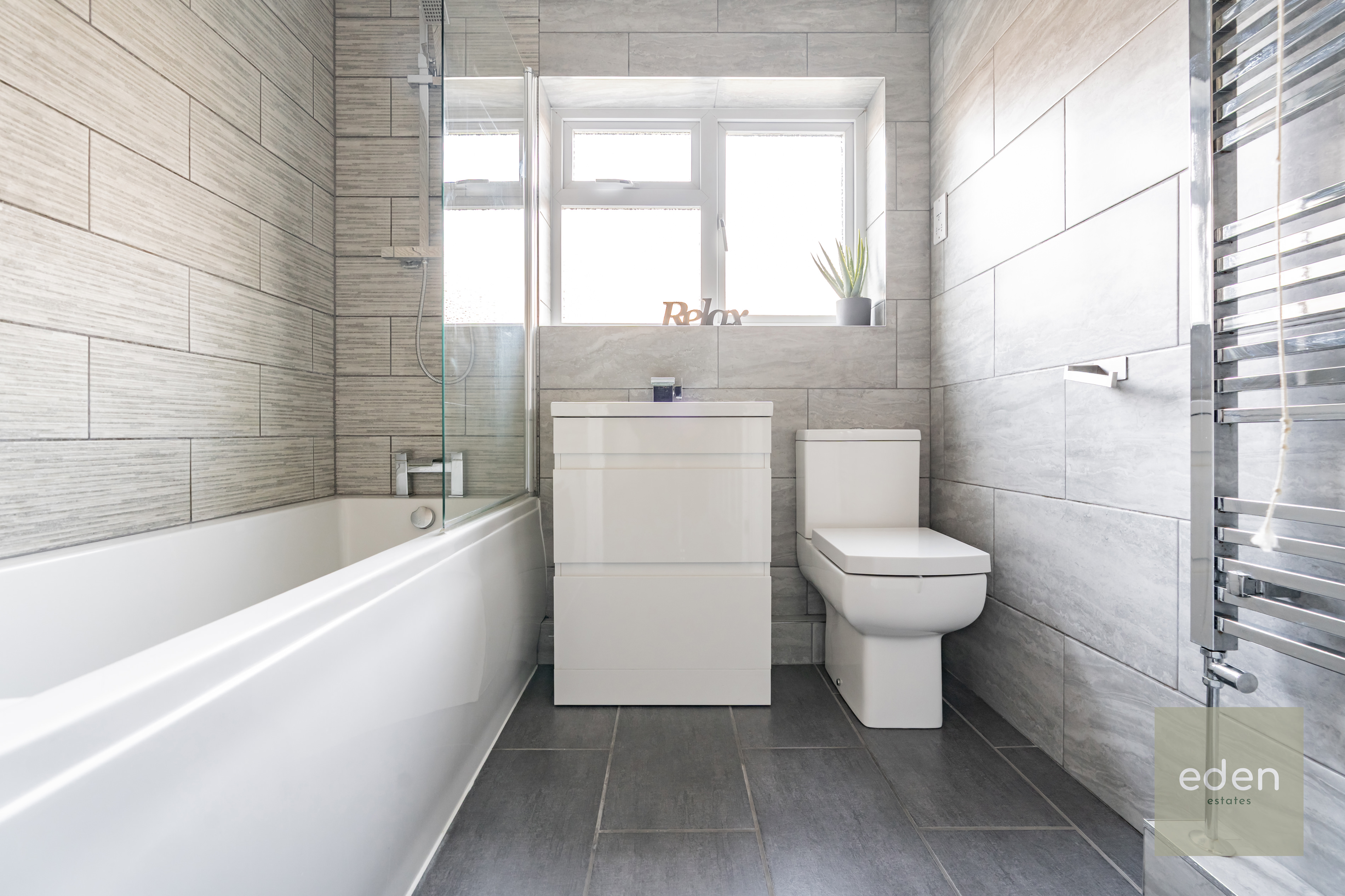 The contemporary kitchen is well presented, featuring a sleek design and ample worktop space and storage. From the back of the kitchen you enter the stylish family bathroom which is finished to a high standard, boasting a modern suite and elegant tiling for a touch of luxury.