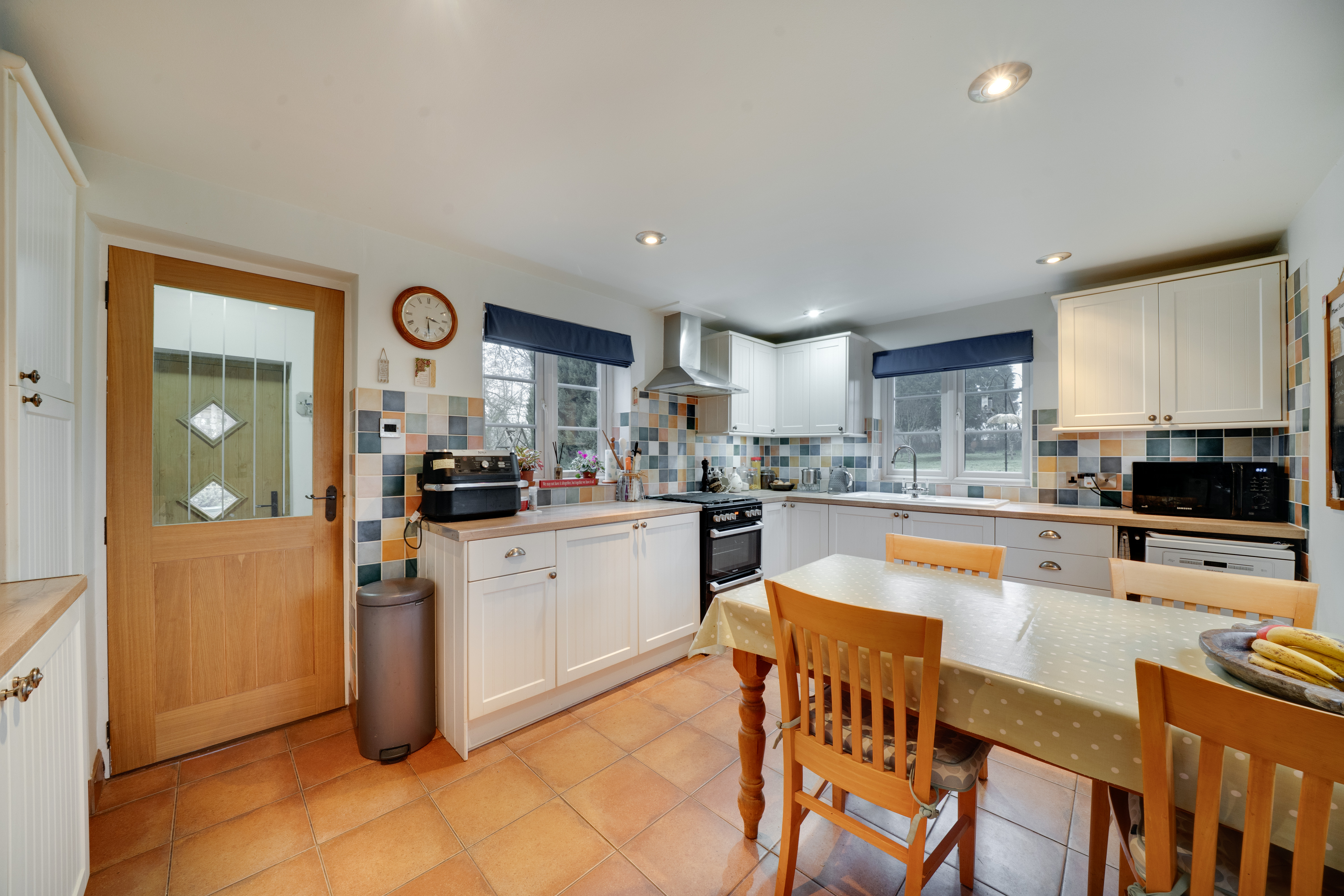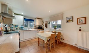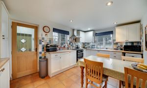 The kitchen is well proportioned and fitted with a range of units, complementary work surfaces and a freestanding dual fuel cooker and dishwasher. There is space for informal dining and pleasant views across the garden, making it a sociable and functional room. A ground floor wet room with hand basin and WC completes the downstairs accommodation.