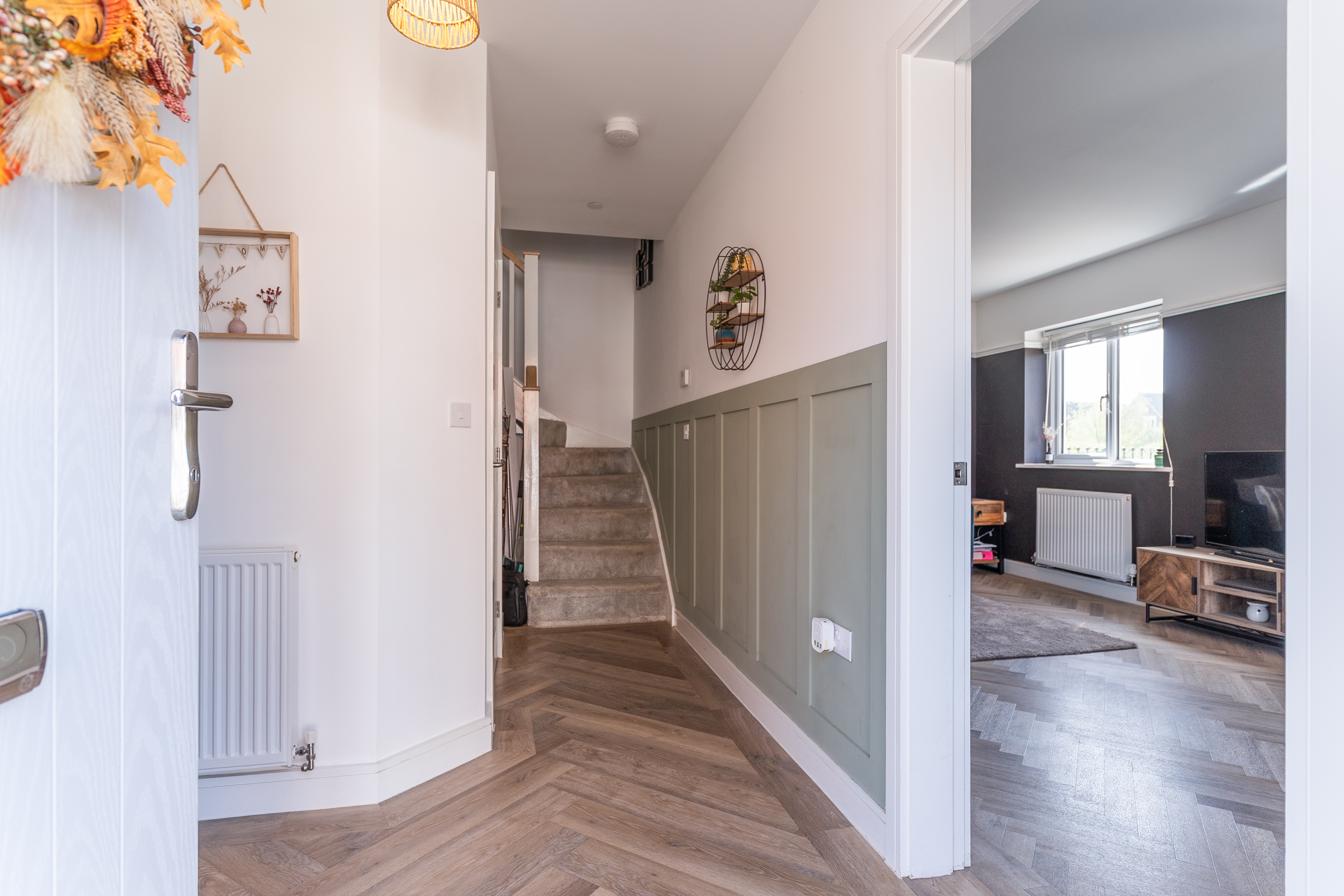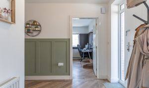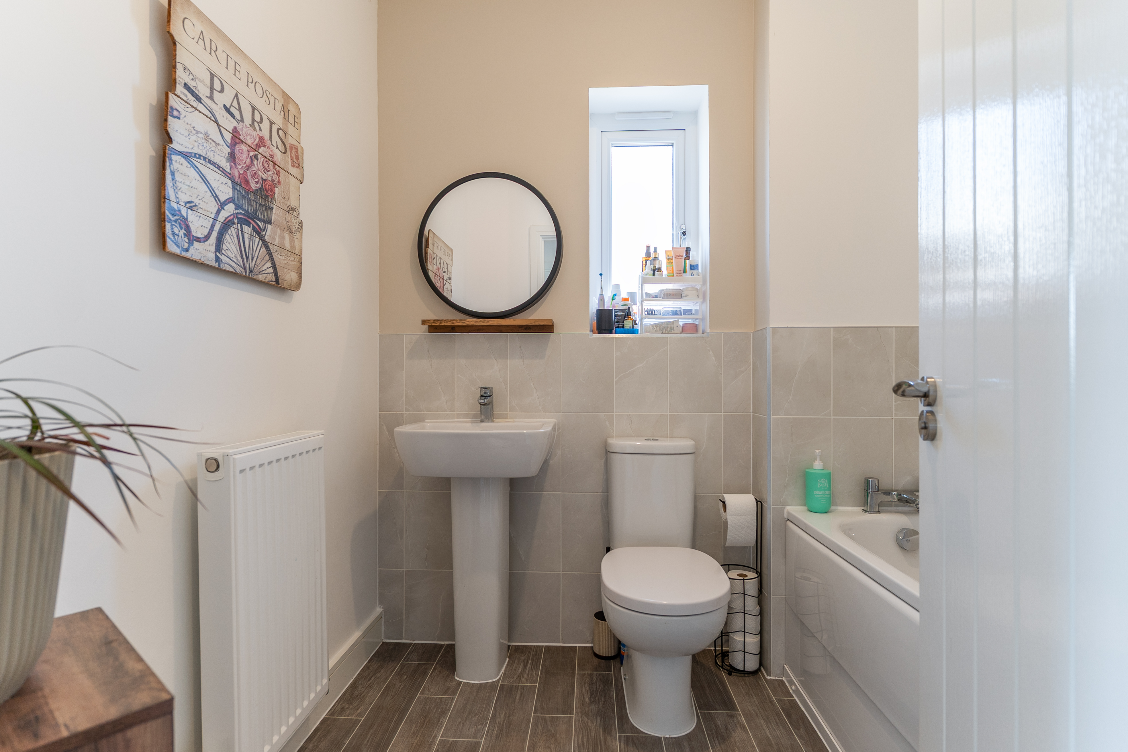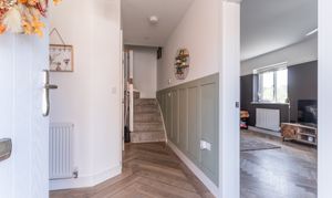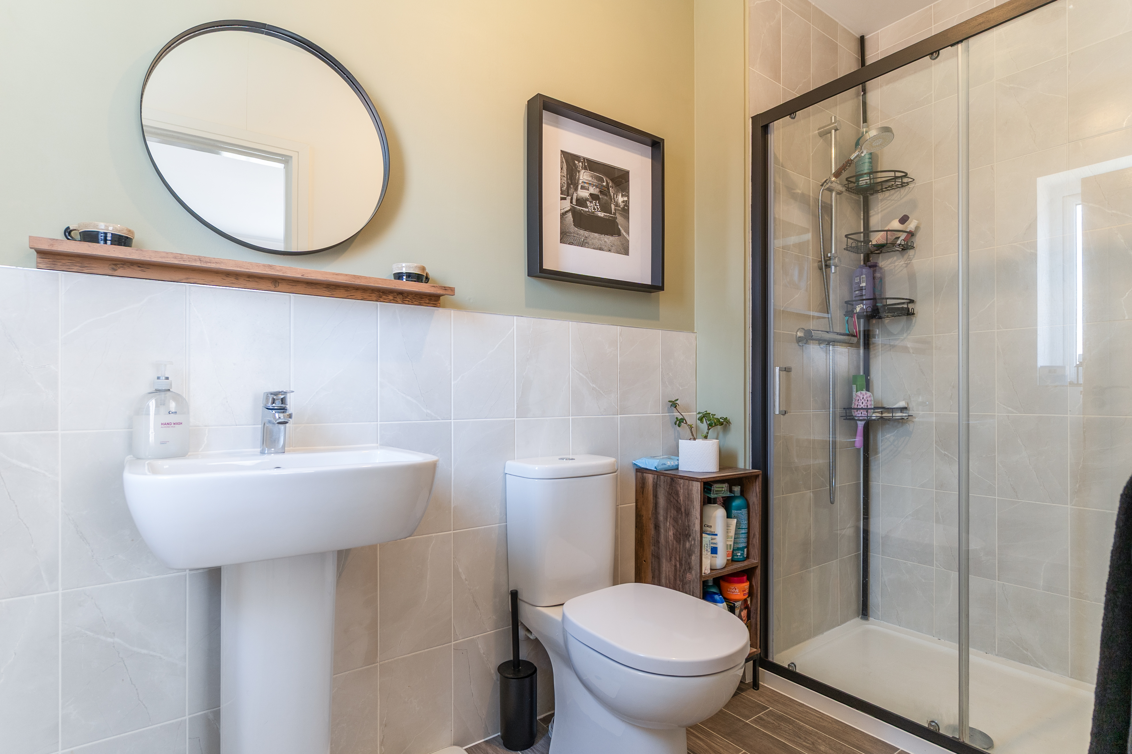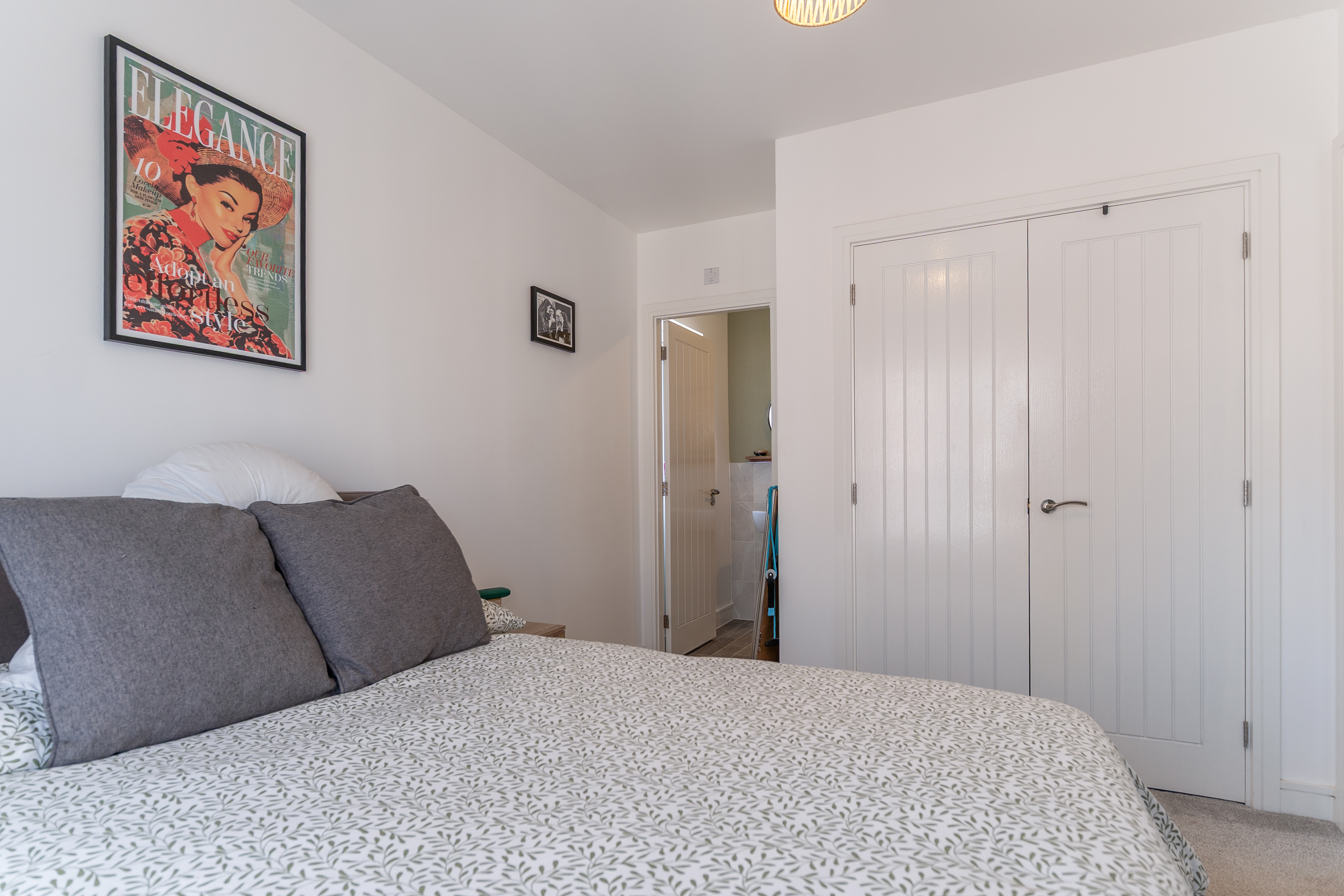 Upstairs, the property offers three well-proportioned bedrooms and a stylish family bathroom. The primary bedroom includes built-in wardrobes and a private en-suite shower room. The remaining two bedrooms are ideal for children, guests or a home office.