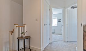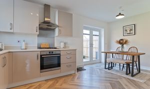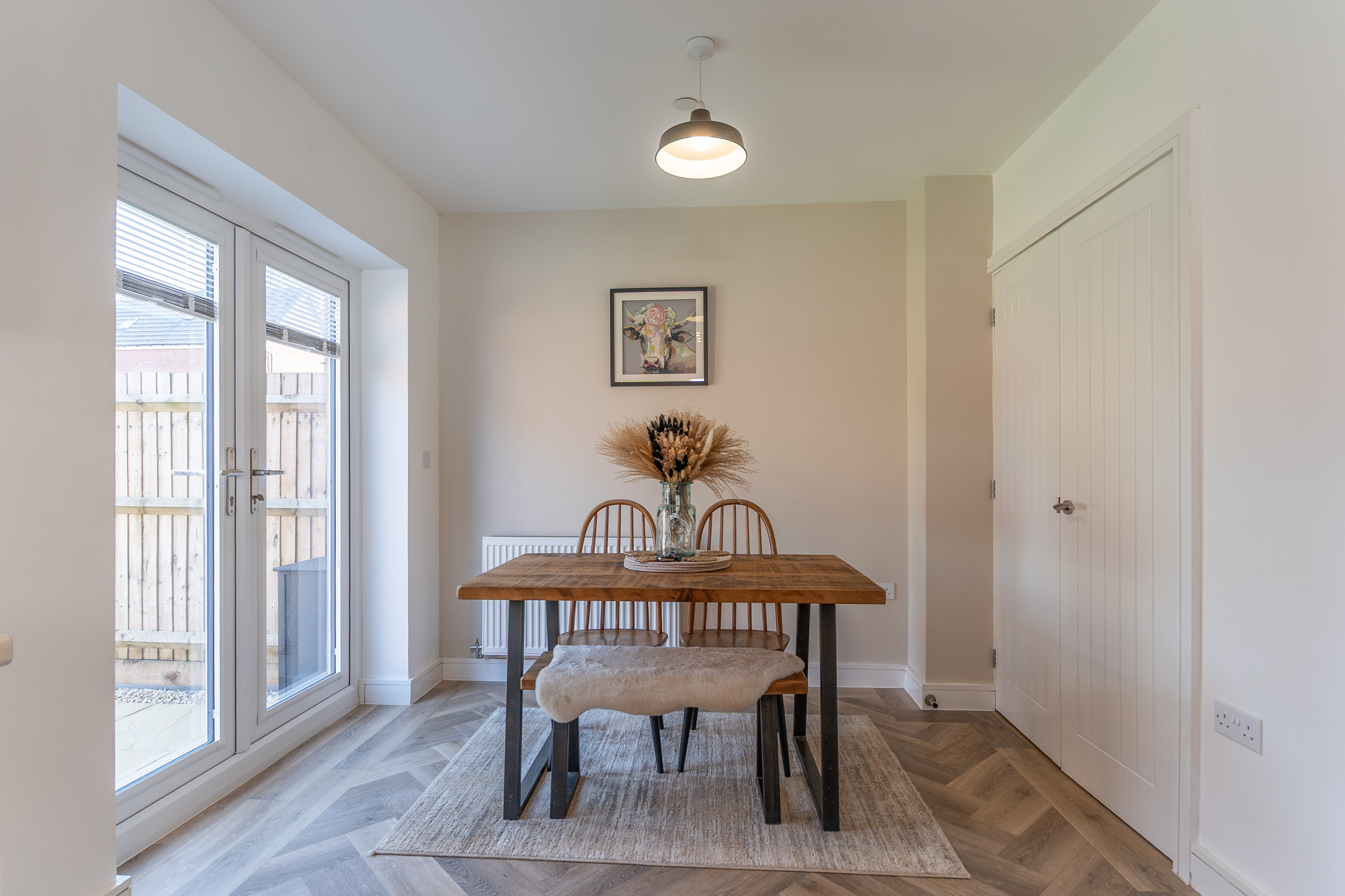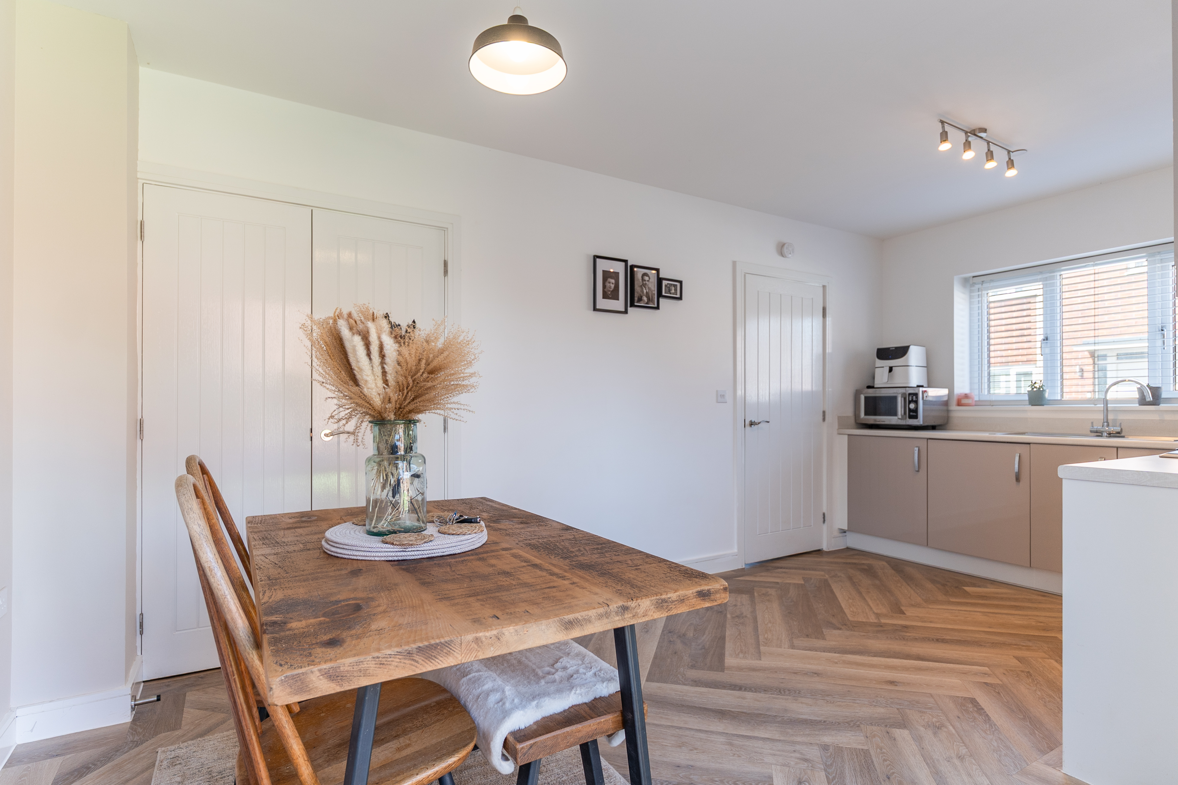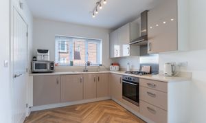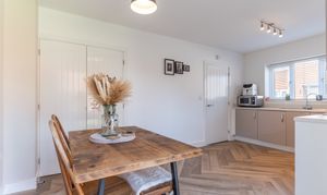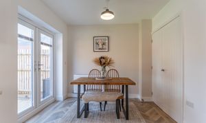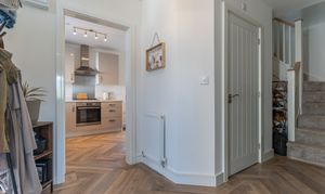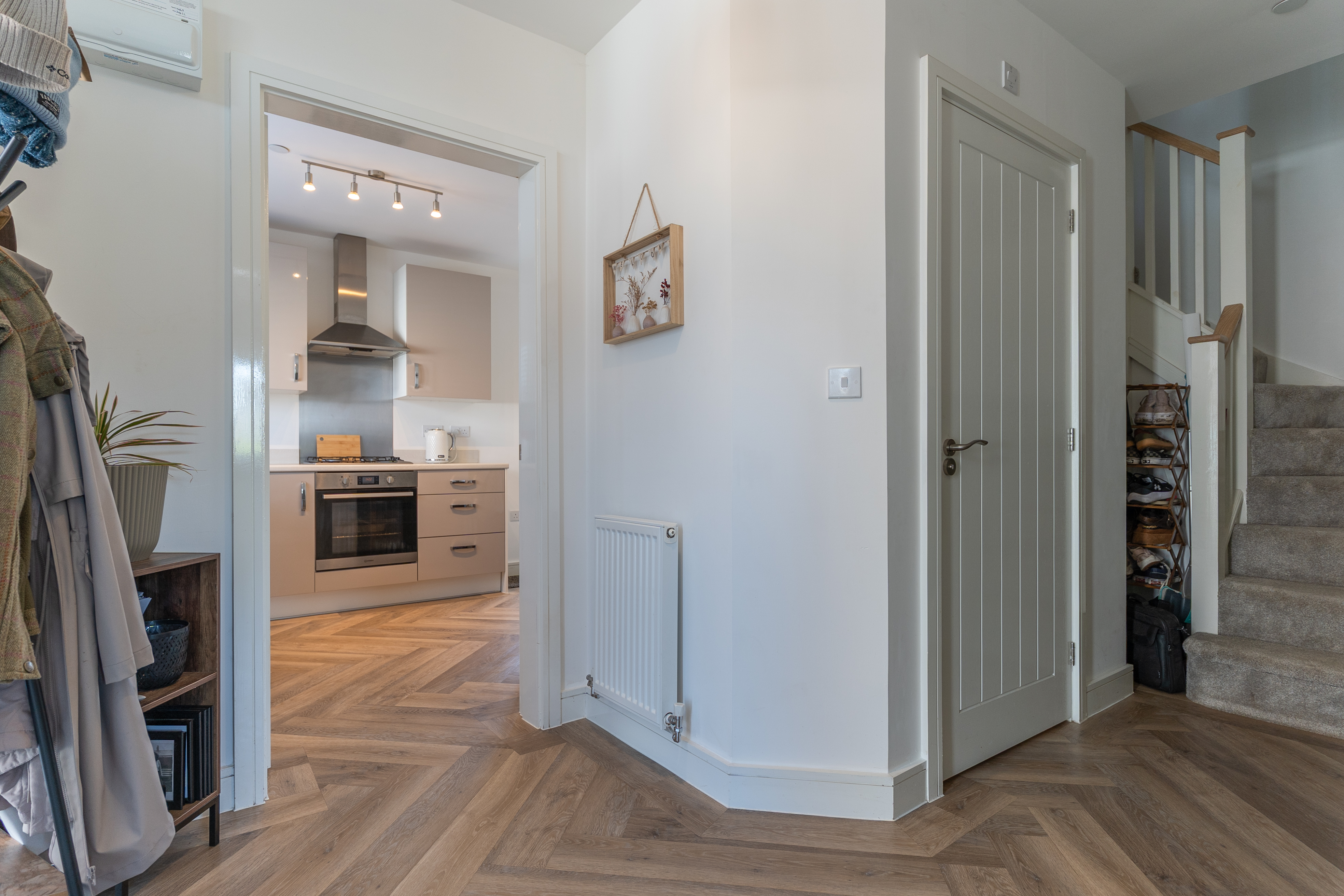 The ground floor begins with a welcoming entrance hall providing access to the main living areas, stairs to the first floor and a convenient cloakroom/WC. To the right is a spacious lounge, filled with natural light from its dual aspect windows. Across the hall to the left is the modern kitchen/diner, featuring a good-sized fitted kitchen, with space for a dining table and chairs and access to a large utility cupboard. French doors from the kitchen open out to the rear garden, creating a natural flow for indoor-outdoor living.
