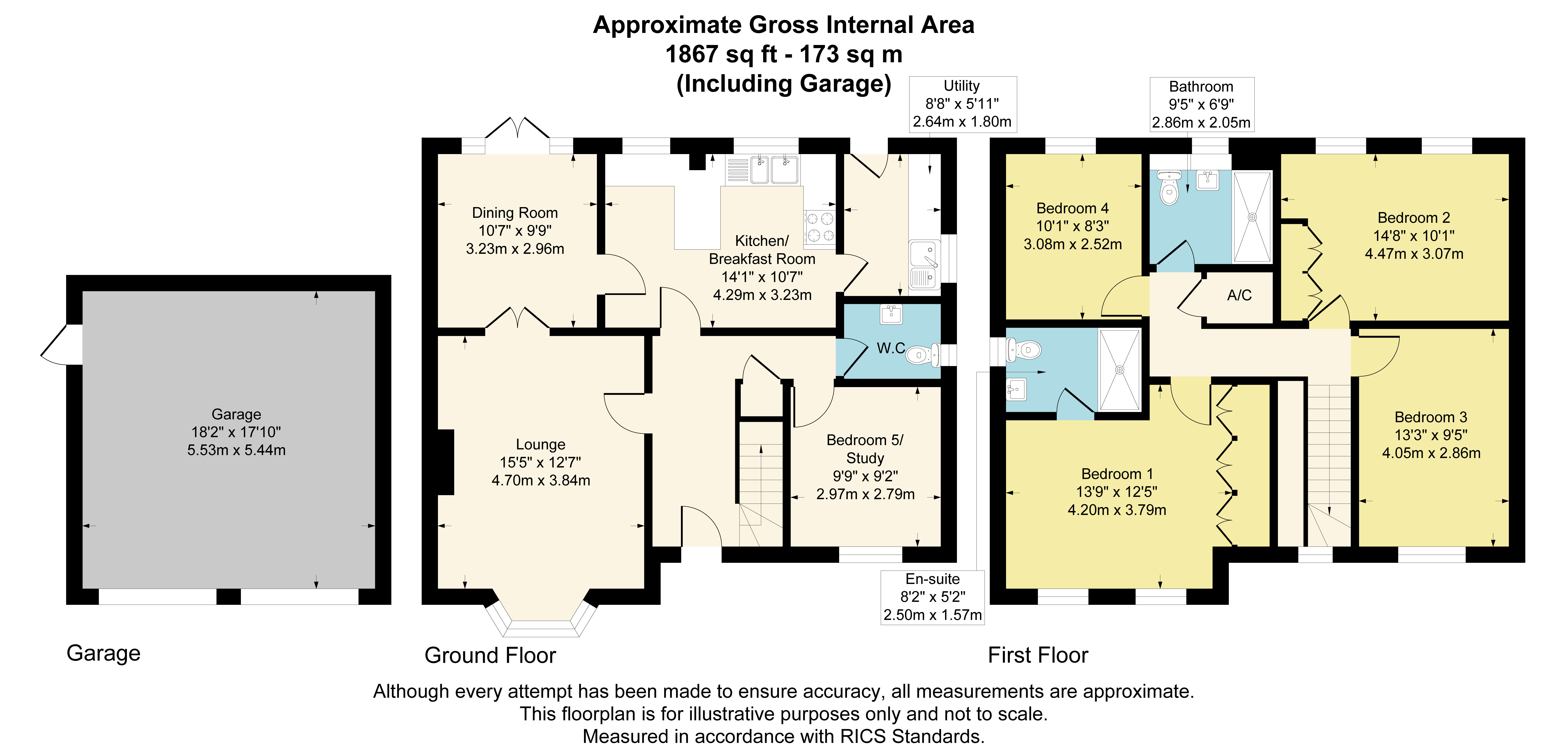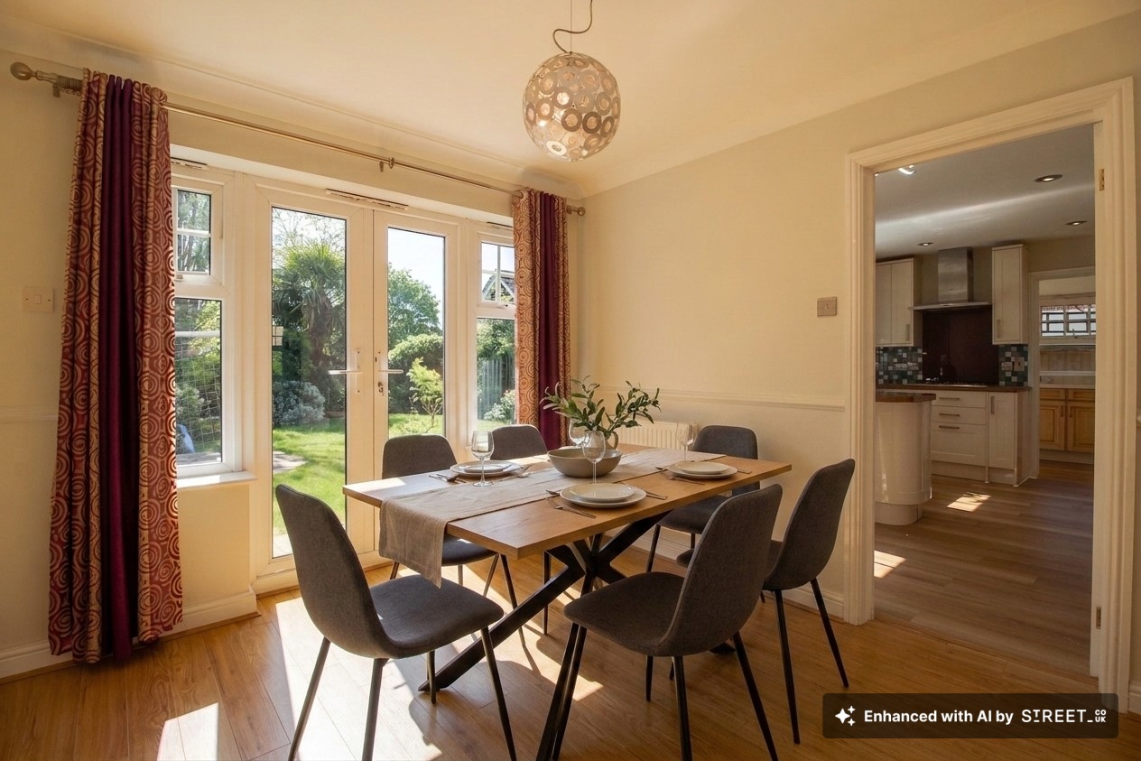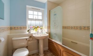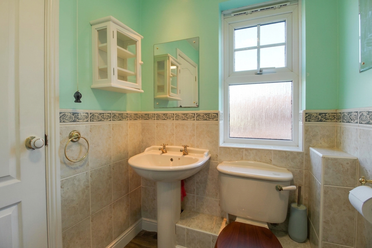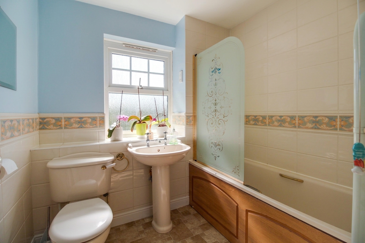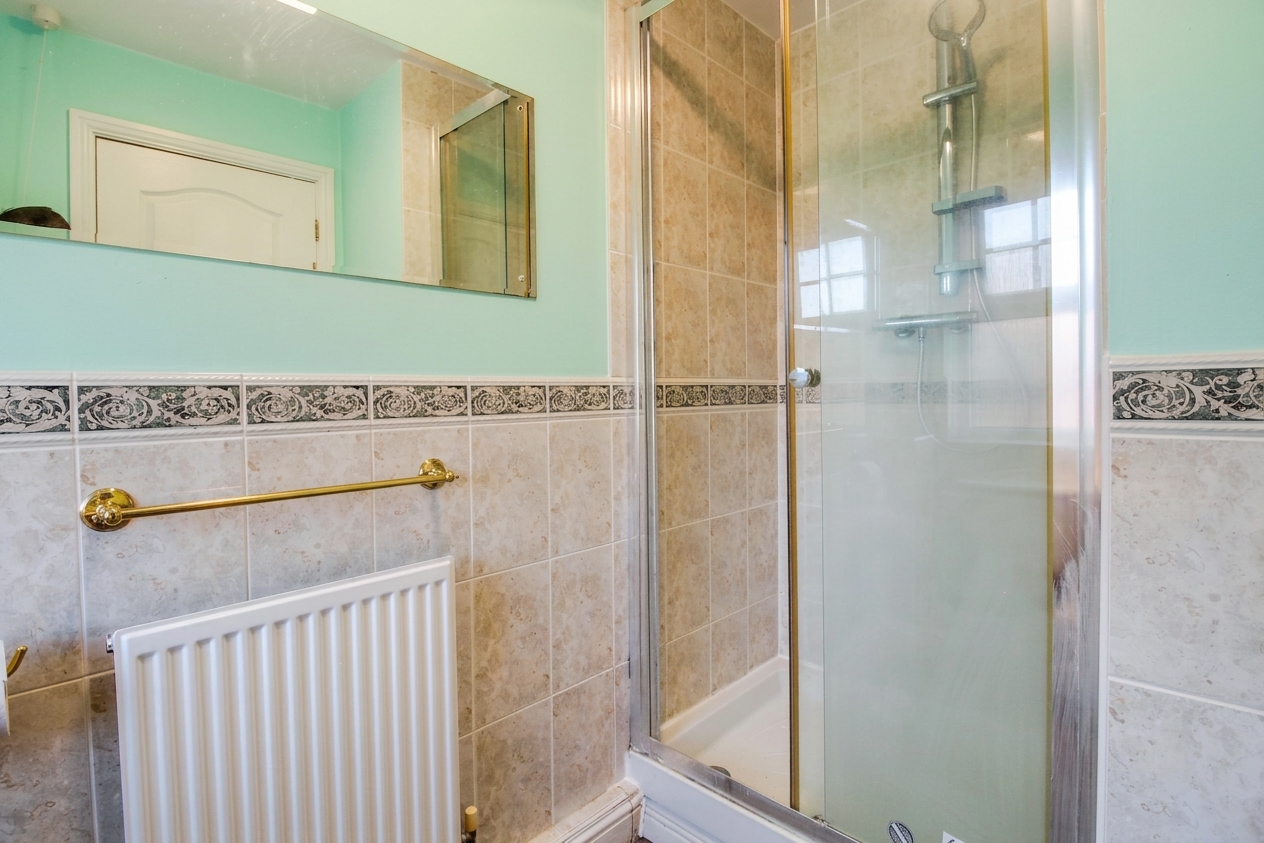 Upstairs, there are four well-proportioned double bedrooms, all generously sized with ample space. The principal bedroom benefits from fitted wardrobes and its own en-suite shower room, while a further bedroom also includes built-in storage. A family bathroom completes the first floor, fitted with a three-piece suite including a bath with a shower over.