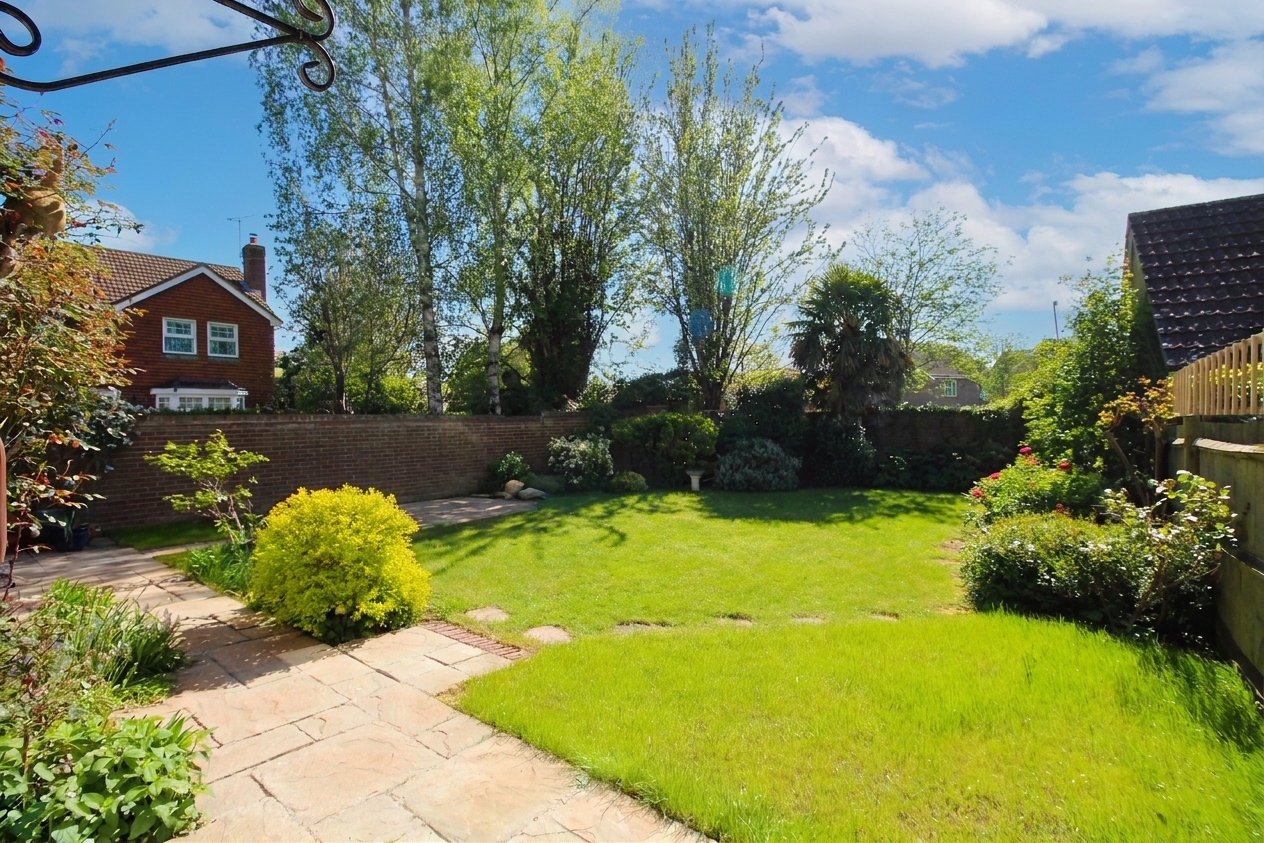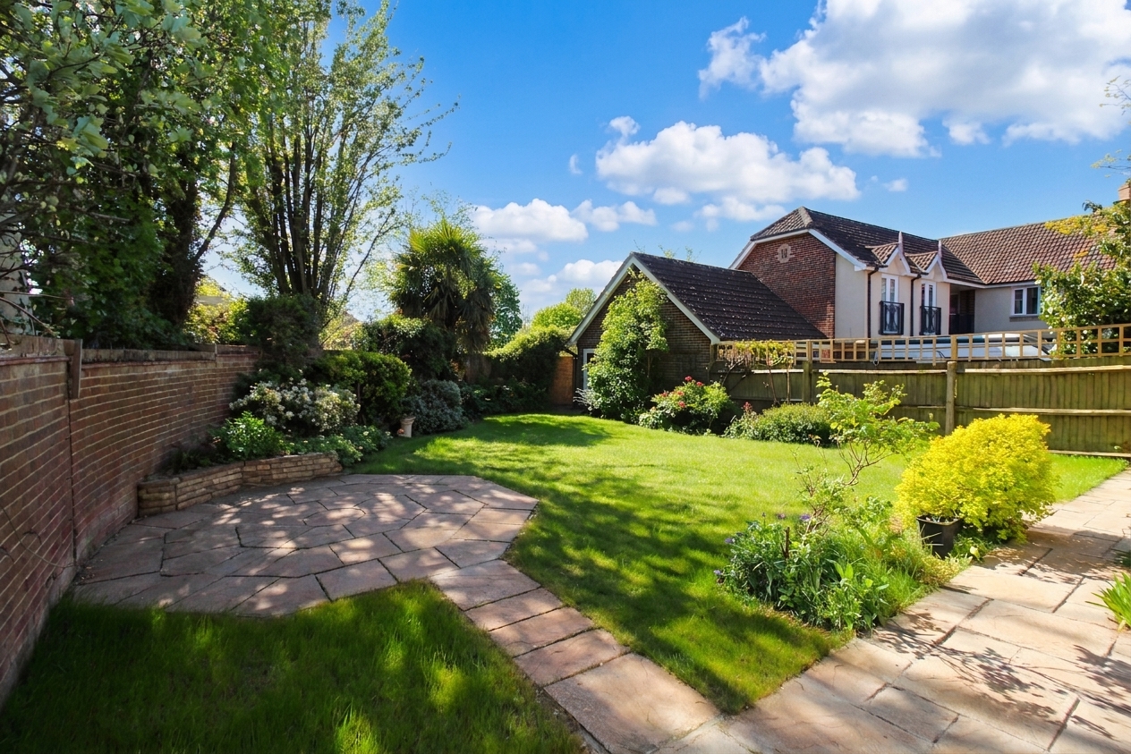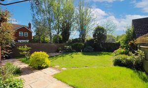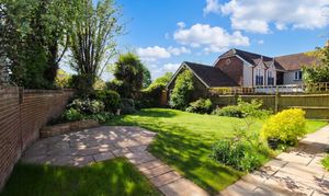 The rear garden has an enclosed walled space, offering privacy and security, with gated side access and personnel door to the garage. A paved terrace extends from the rear of the house, leading to an attractive octagonal patio—ideal for outdoor dining and entertaining. The garden is beautifully landscaped with planted borders and beds featuring a variety of flowering shrubs and plants, including palm, peonies, and roses, along with outside lighting and a water tap.