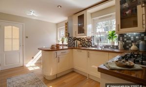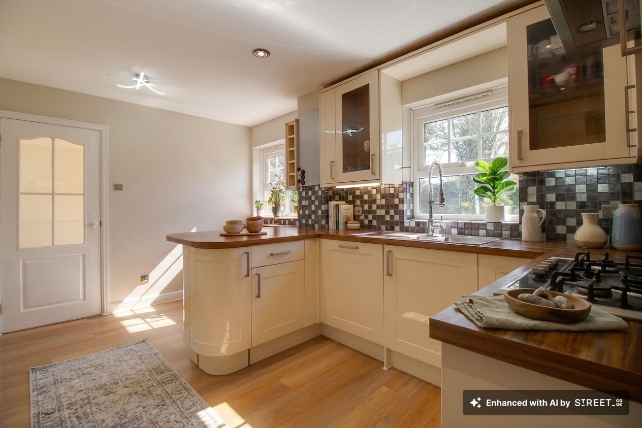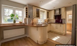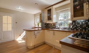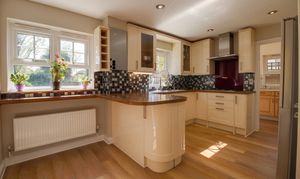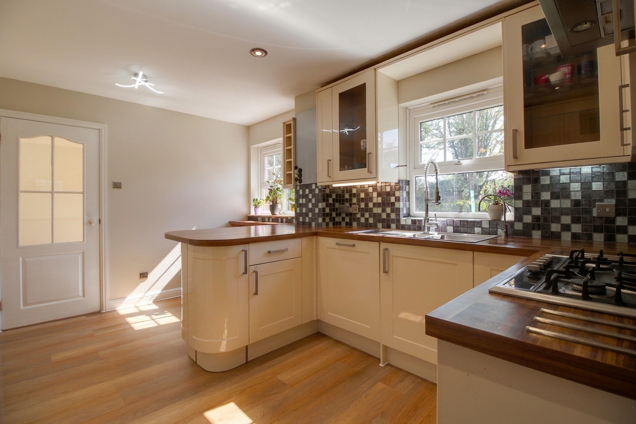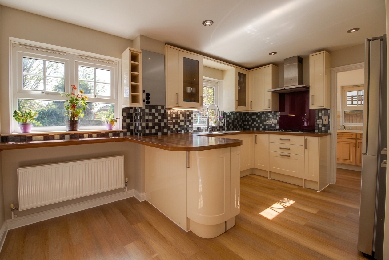 Windows to the rear overlooking the garden, radiator and laminate wood flooring. Door into Utility Room. Fitted kitchen comprising matching wall and base units with worksurfaces over, inset 1.5 bowl sink/drainer with mixer and filtered water taps, built-in eye-level oven/grill, 5-ring gas hob with extractor hood over, dishwasher and space and plumbing for American style fridge/freezer.