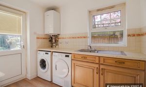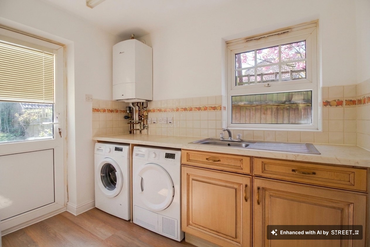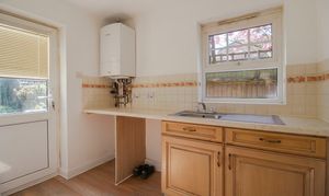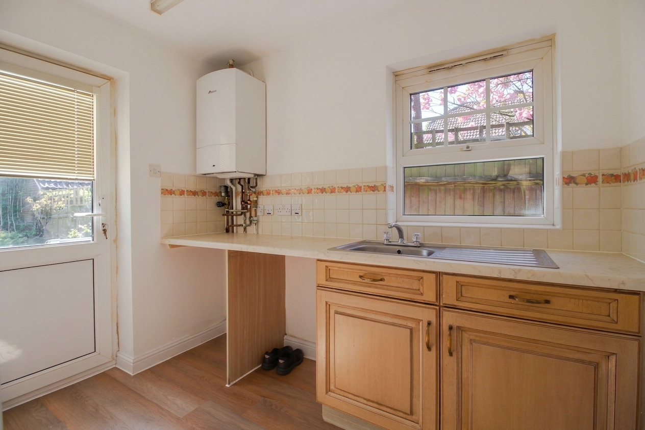 Window to the side and door leading to the garden, base unit with worksurface over, inset sink/drainer, wall mounted central heating gas boiler, plumbing and space for washing machine and tumble dryer, radiator and laminate wood flooring.
