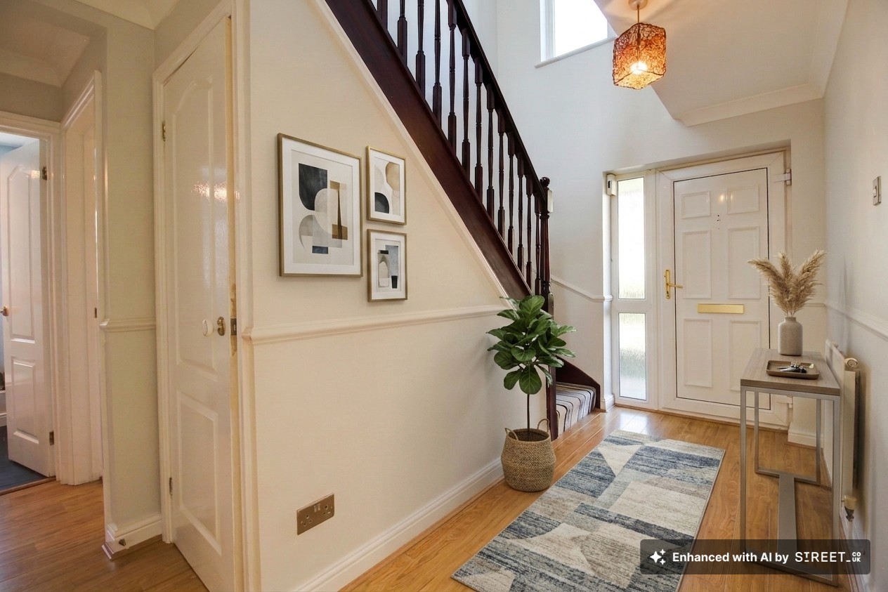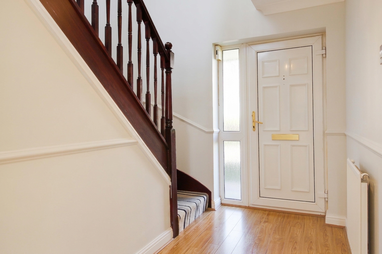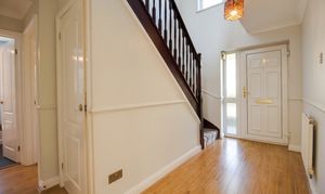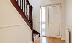 uPVC door to the front with sidelight window, stairs to the first floor with under-stairs cupboard, doors to each room, radiator and laminate wood flooring.