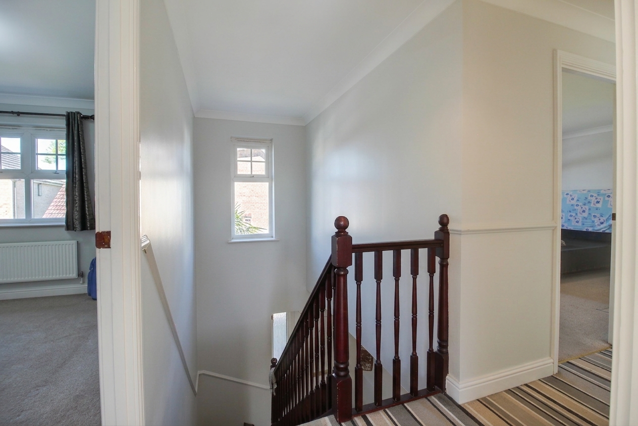 Double height above stairwell with window to the front, doors to each room, loft access, radiator and fitted carpet to the stairs and landing.