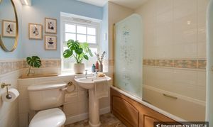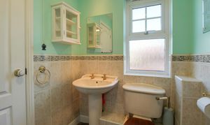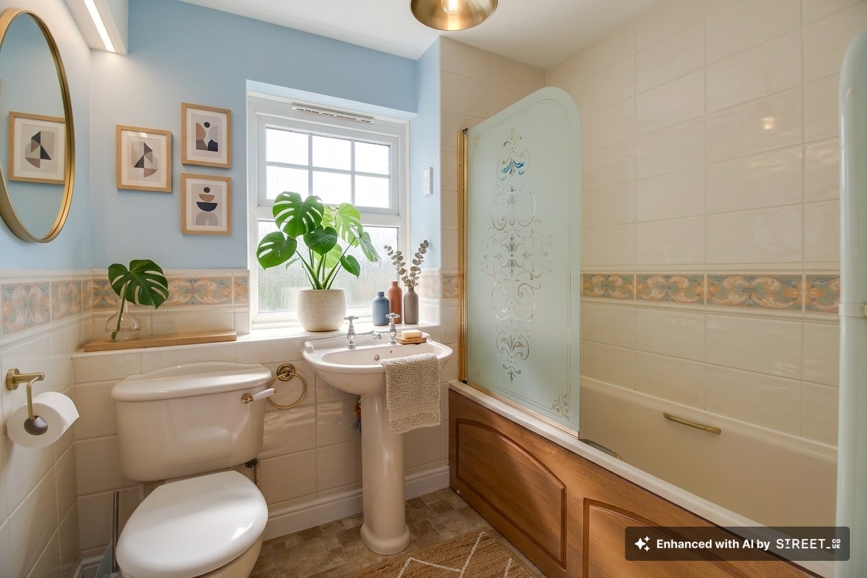 Window to the rear, bath with mixer taps, shower attachment and glass shower screen, WC, wash basin, extractor fan, radiator, heater towel rail, shaver socket, half height wall tiling, (fully tiled around the bath) and vinyl flooring.