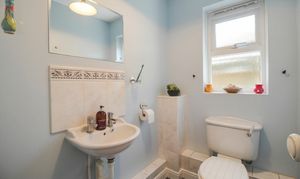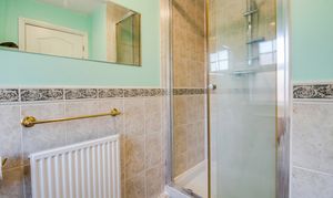 Window to the side, rectangular shower enclosure with thermostatic shower, WC, wash basin, extractor fan, radiator, shaver socket, half height wall tiling (fully tiled to shower enclosure) and vinyl flooring.