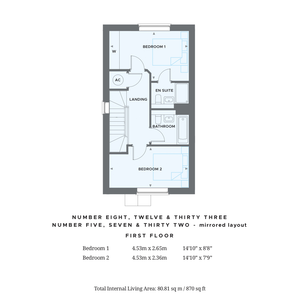 These 2 bedroom houses extend to 870 ft.²/80.81 m² making them larger than most 2 bedroom houses currently being built by any other developer in the district. On the ground floor there is an entrance hall with cloakroom, fully equipped kitchen and a very large L shaped lounge/dining room with doors out to the rear gardens.