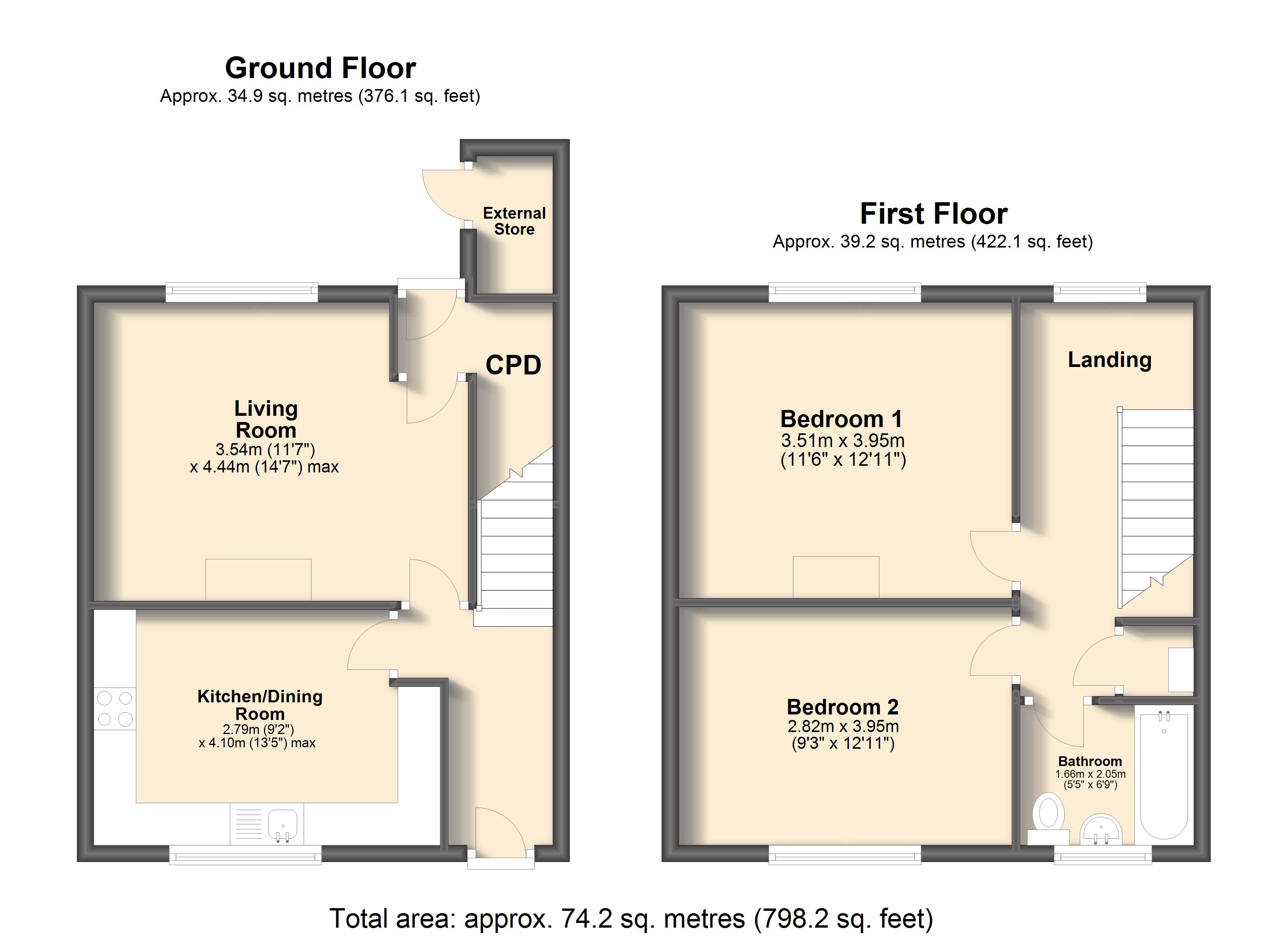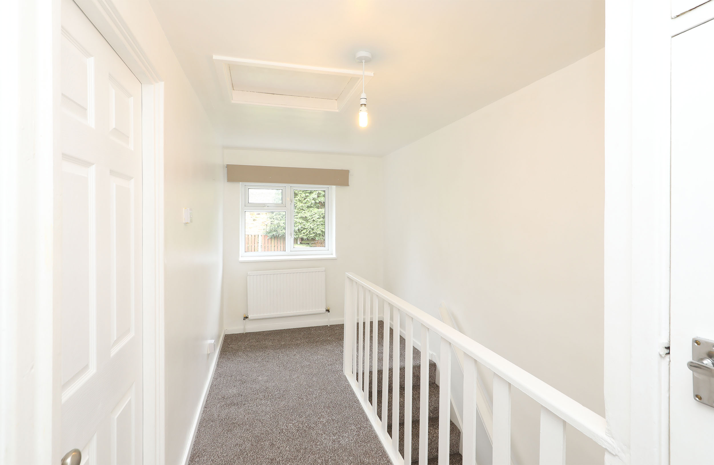 Upstairs, there are two well-sized double bedrooms, each with space for freestanding furniture. The bathroom has been recently updated and features a modern white suite with a bath and overhead shower. The landing also offers enough space for a small desk or study area if required.