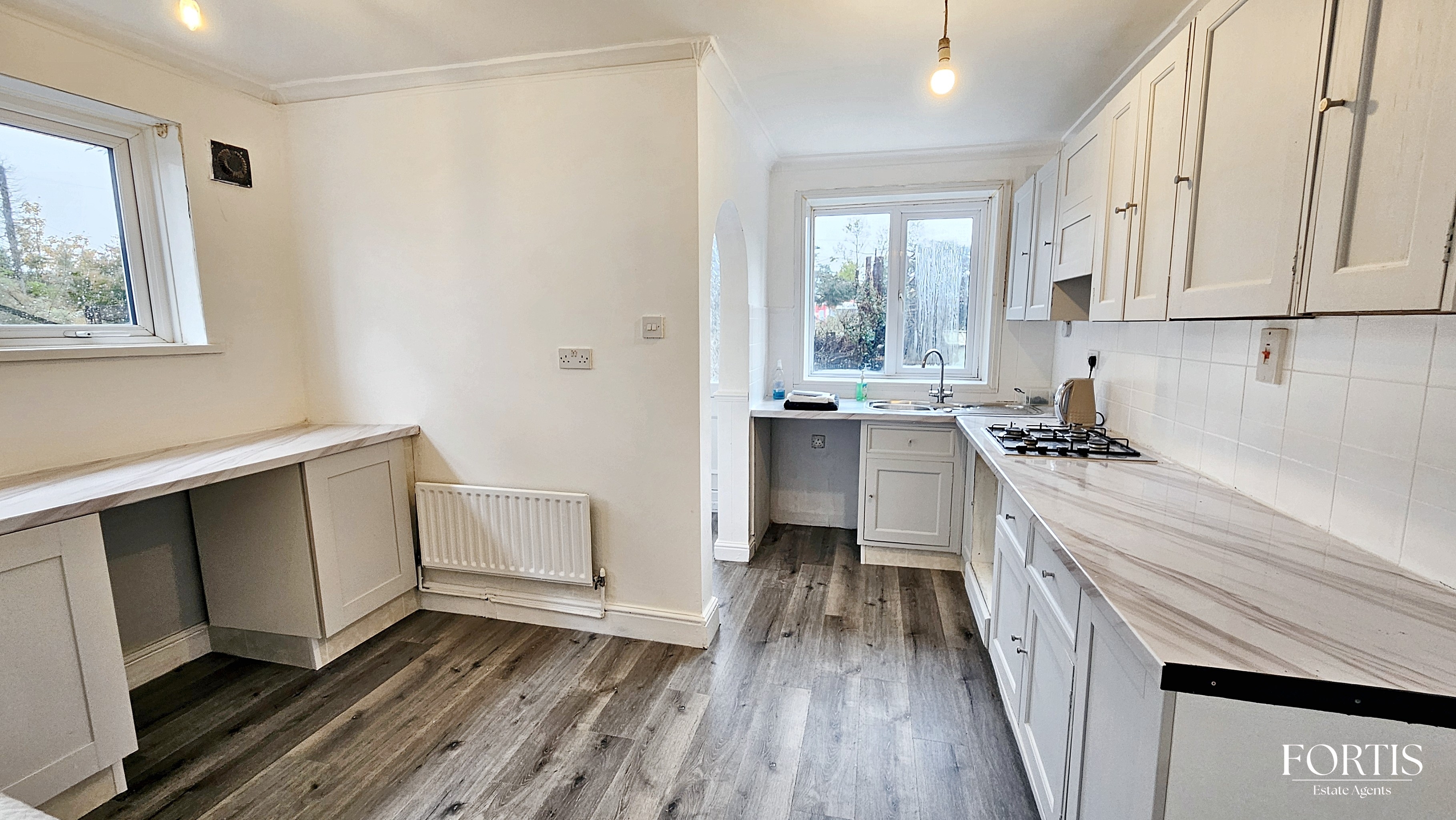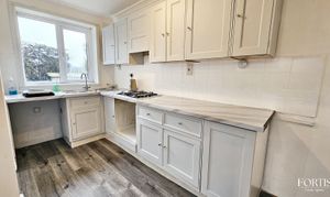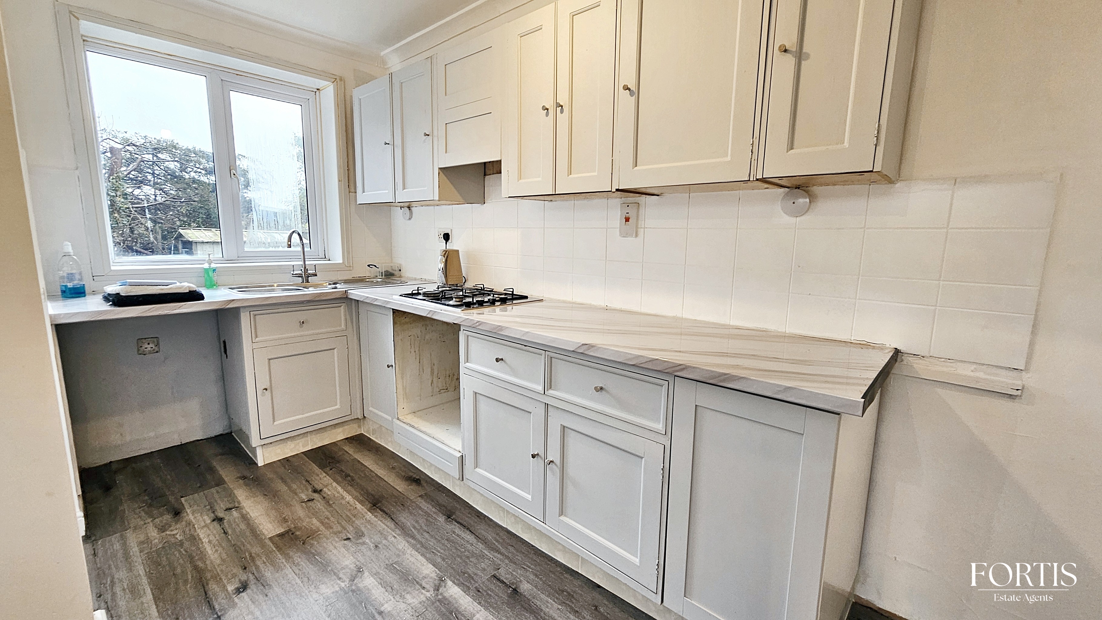 Fitted with a range of wall and base level cupboard and drawer units with work surfaces over, inset sink and drainer with mixer tap, tiled splash backs, integrated four ring gas hob, space for an integrated oven, space for washing machine and fridge freezer, double glazed rear aspect window, wood effect flooring, doorway to: