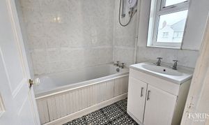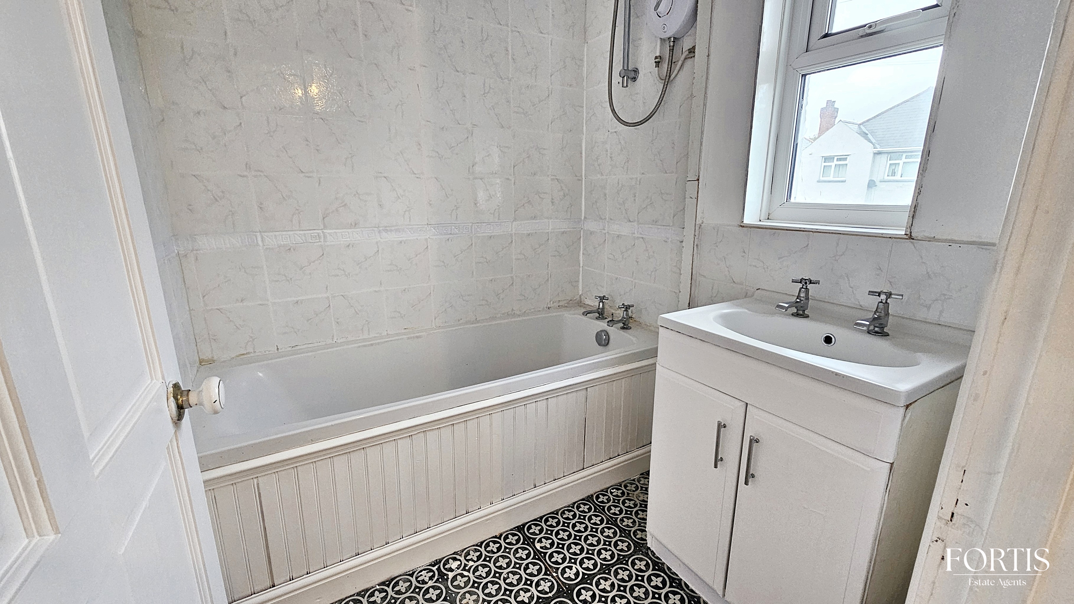 A white 2 piece suite comprising panel enclose bath with electric shower over and tiled surround, vanity unit with inset wash basin and storage cupboards beneath, double glazed front aspect window, recessed low voltage ceiling spot lights.