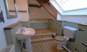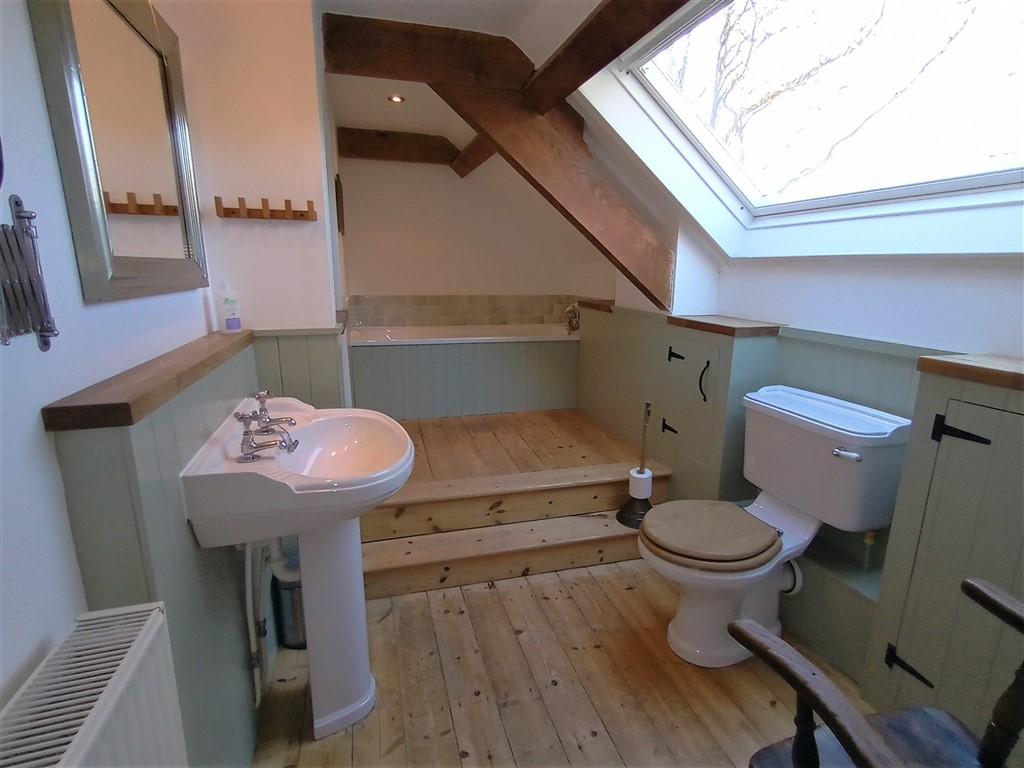 Panelled bath, pedestal wash hand basin, low-level WC, large Velux window, spotlighting, shaver light, and exposed wooden flooring.