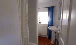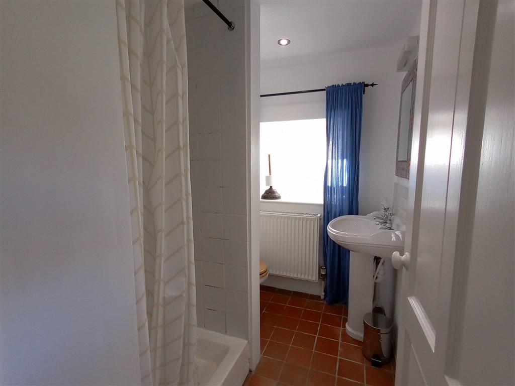 Fitted with shower cubicle, pedestal wash hand basin, low-level WC, side window, extractor fan, shaver light, and tiled flooring.