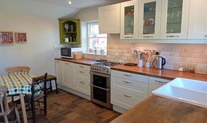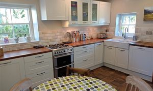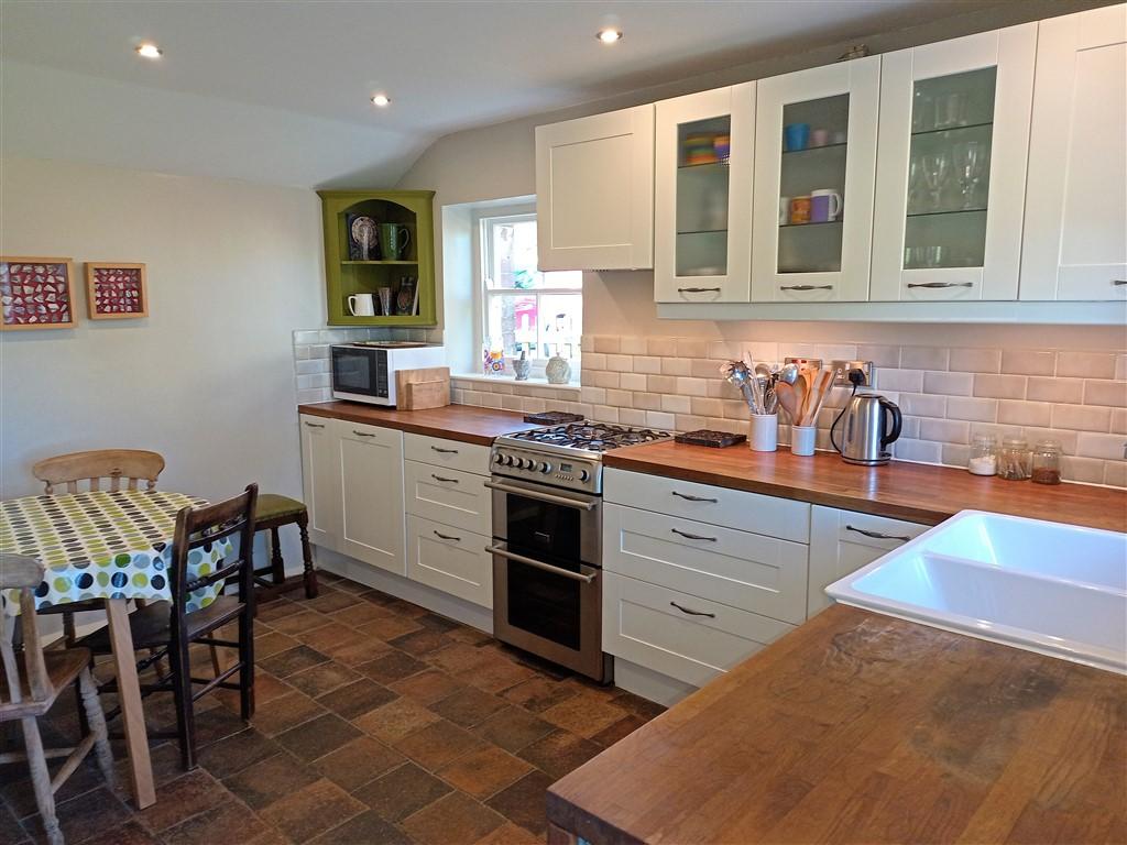 Well-appointed kitchen with wall and base units, tiled splashbacks, spotlighting, LPG gas cooker, enamel sink, dishwasher, washing machine, and tiled flooring. Windows to front and side, plus stable-style door to garden.