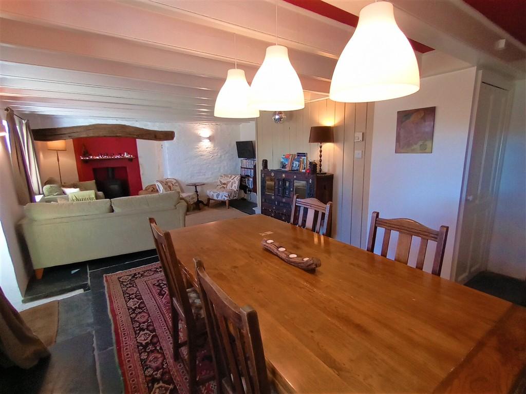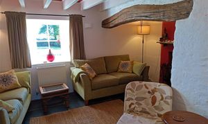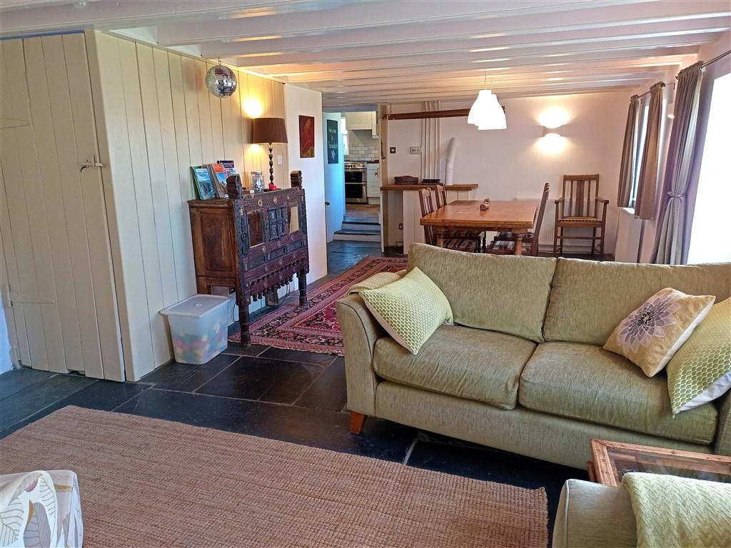 A superb, character-filled space featuring a magnificent inglenook fireplace with wood-burning stove and side alcove. Slate slab flooring, exposed beams, three radiators, two front-facing windows, under-stairs storage, and staircase to first floor.