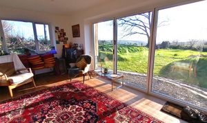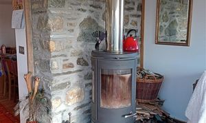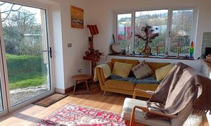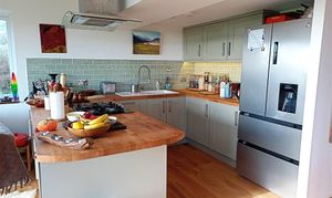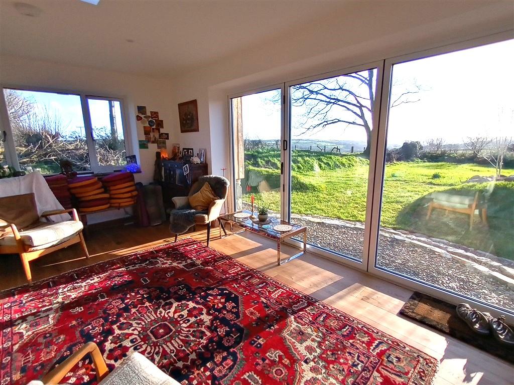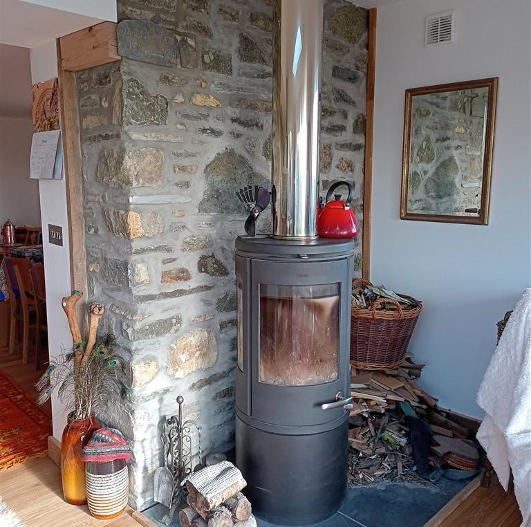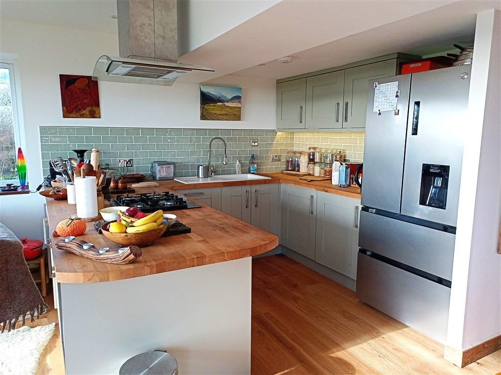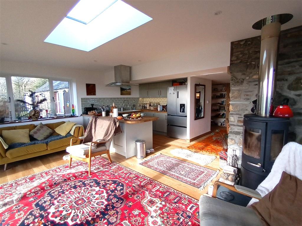 Stunning open-plan room with bifold doors opening to garden and panoramic views. Dual-aspect windows, Morso wood-burning stove, new fitted kitchen with built-in oven, LPG hob, dishwasher, and washing machine space.