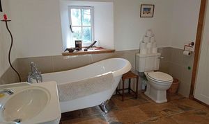 Brand-new suite with roll-top bath, shower cubicle, wash hand basin, and WC. Includes tiled flooring, rear window, radiator, and airing cupboard.