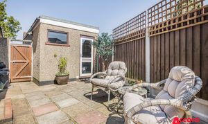 The garden stretches approximately 12 metres by 8 metres and is designed for easy upkeep with a combination of patio and planting areas. There's also side access and good space for storing bins or garden tools.
