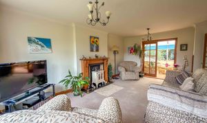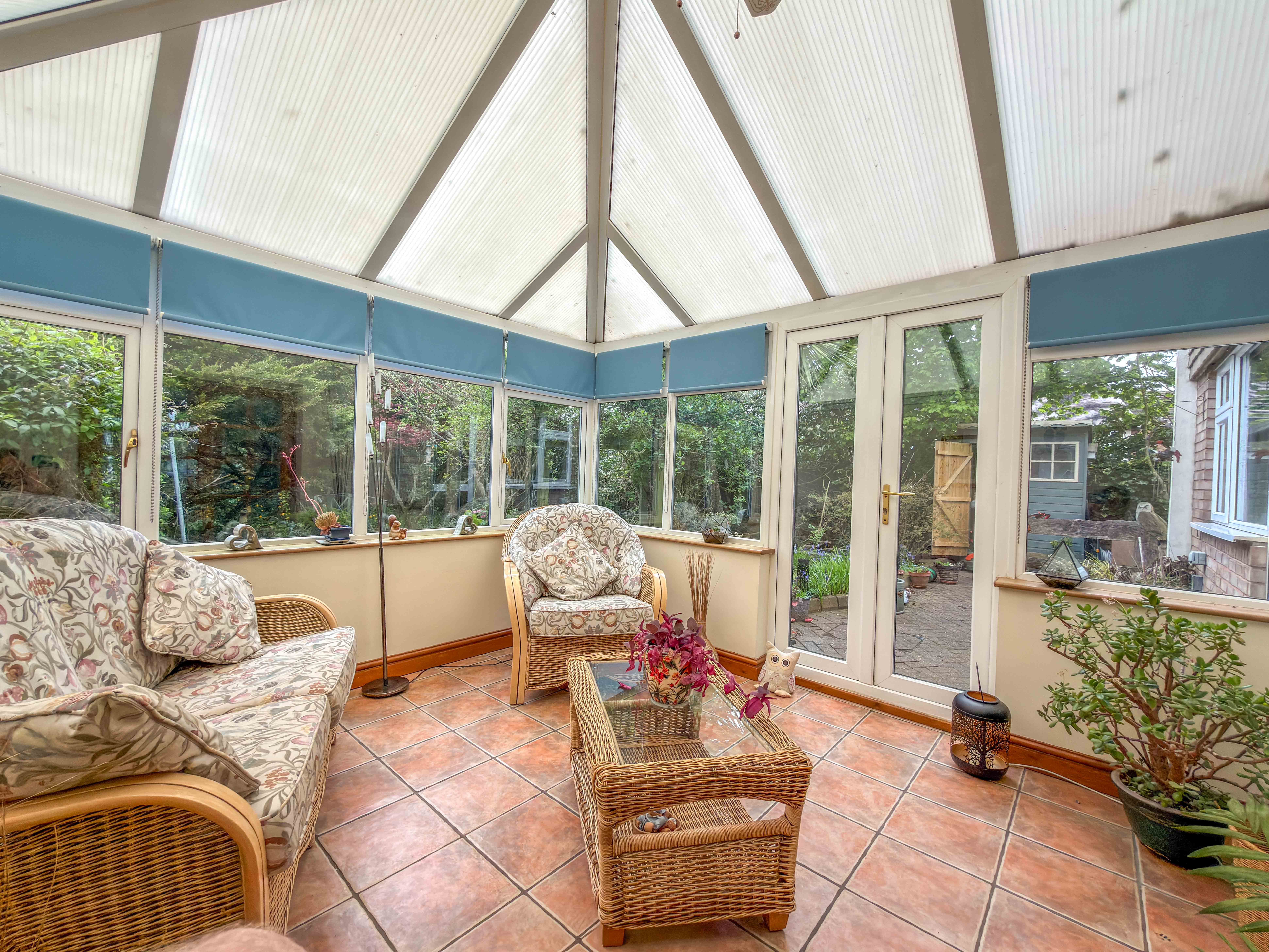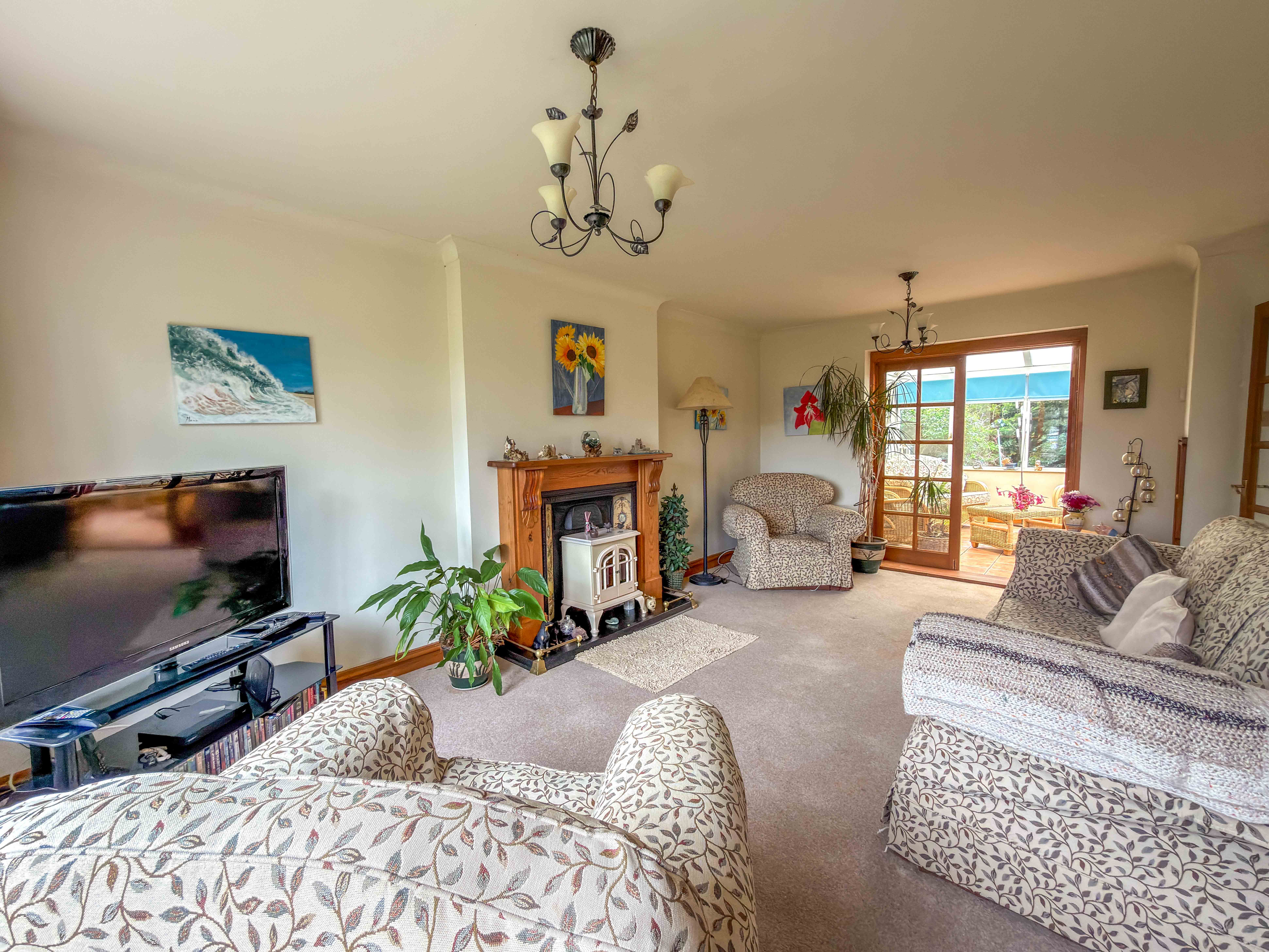 The lounge is a comfortable and inviting space, featuring a fireplace with a freestanding electric fire, and doors opening into a light-filled conservatory — perfect for relaxing or enjoying views over the garden.