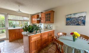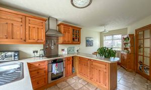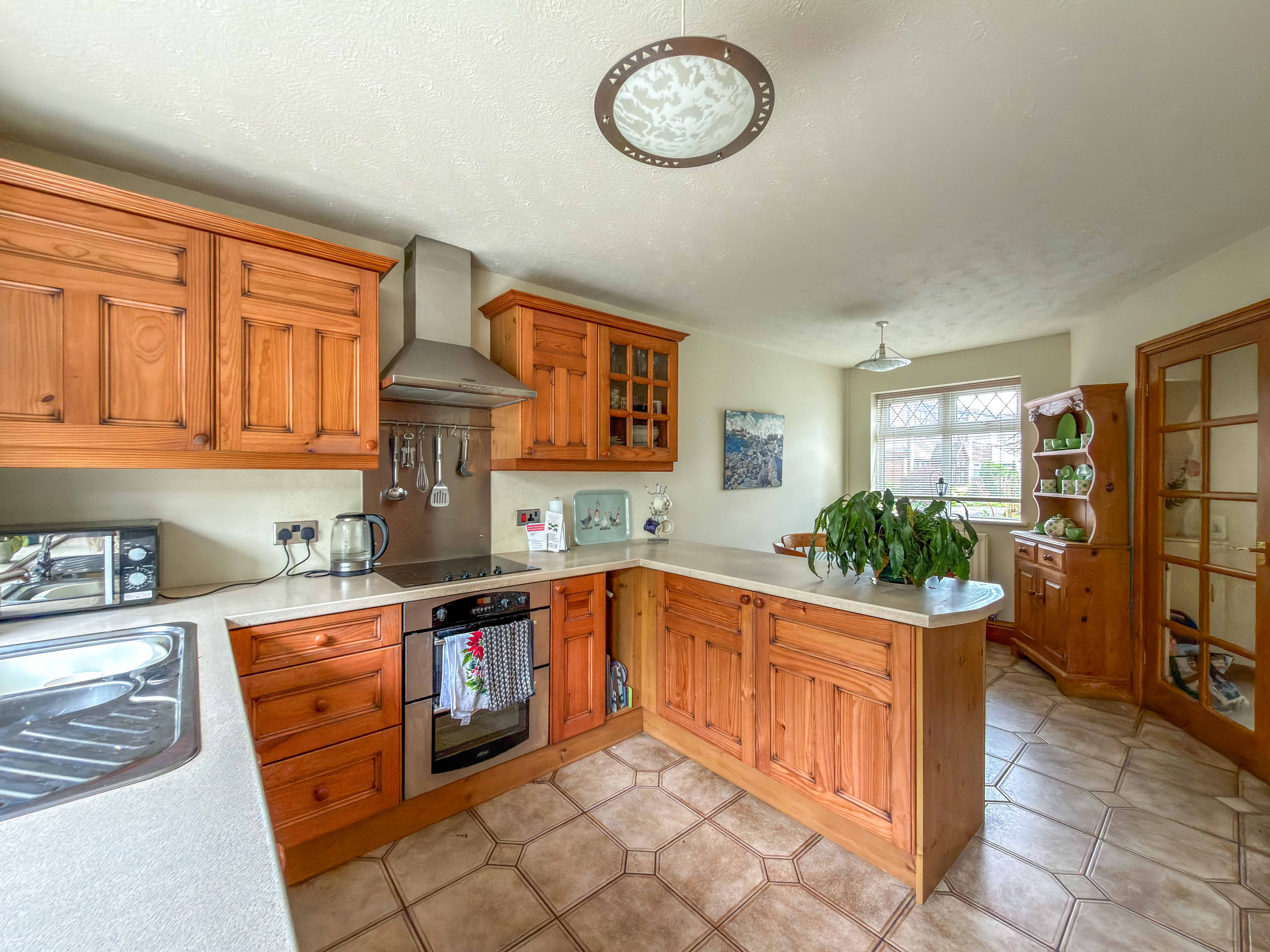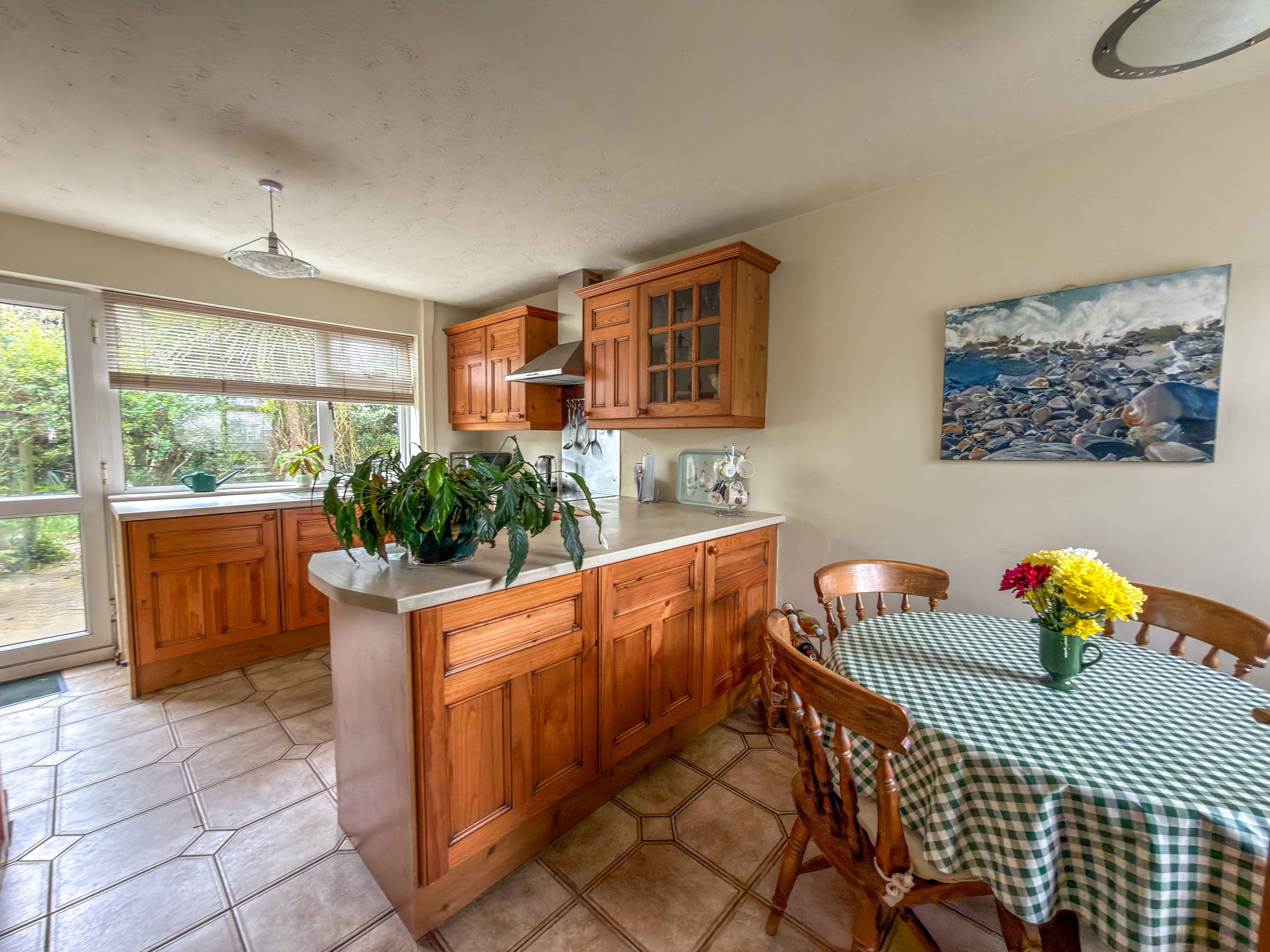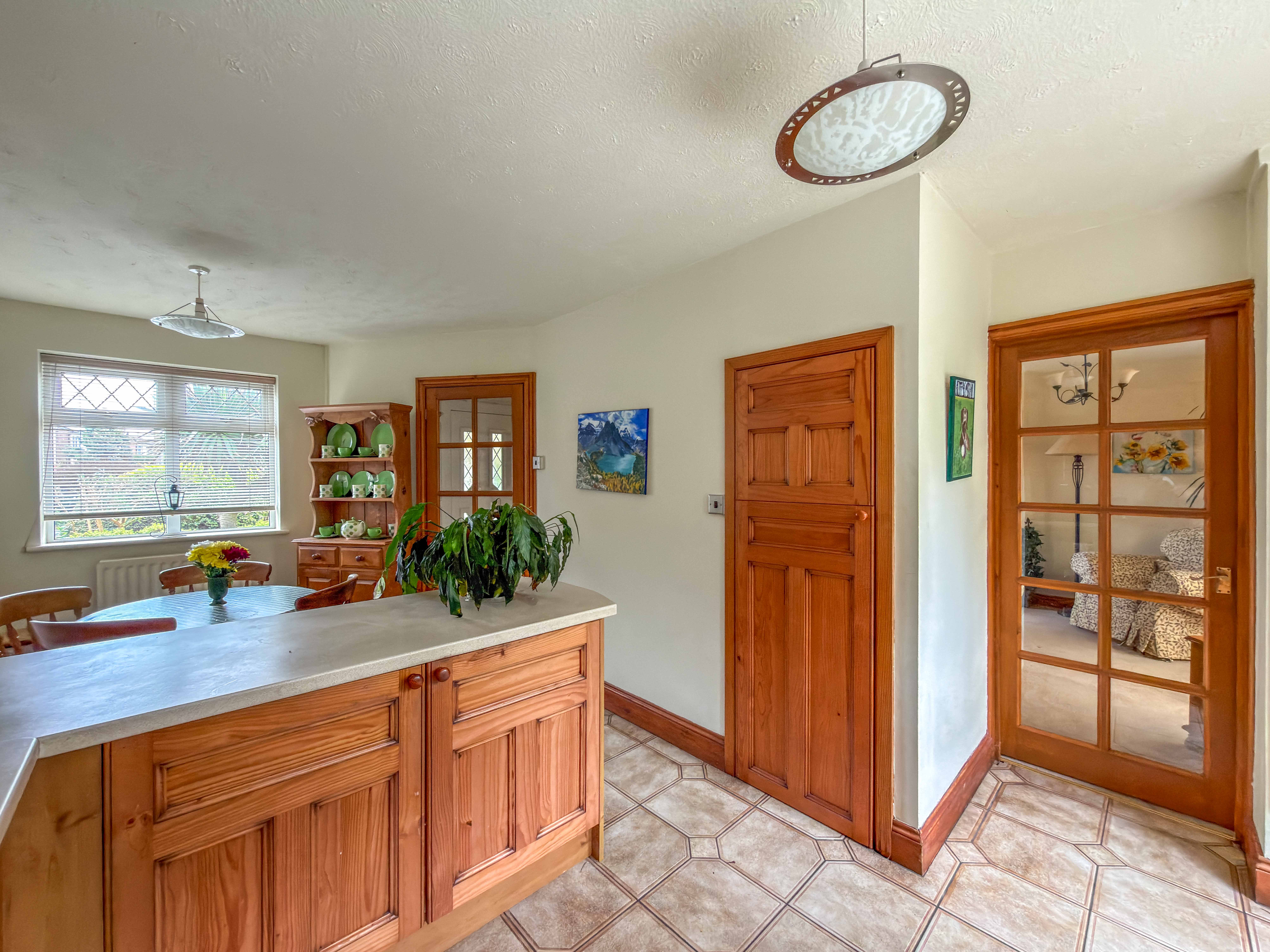The kitchen is fitted with a range of modern units and fully integrated appliances, including an oven, hob with extractor, fridge, freezer, dishwasher, and washing machine. There is ample space for family dining, along with two useful storage cupboards and access to both the garden and the lounge — making it an ideal hub for everyday living.