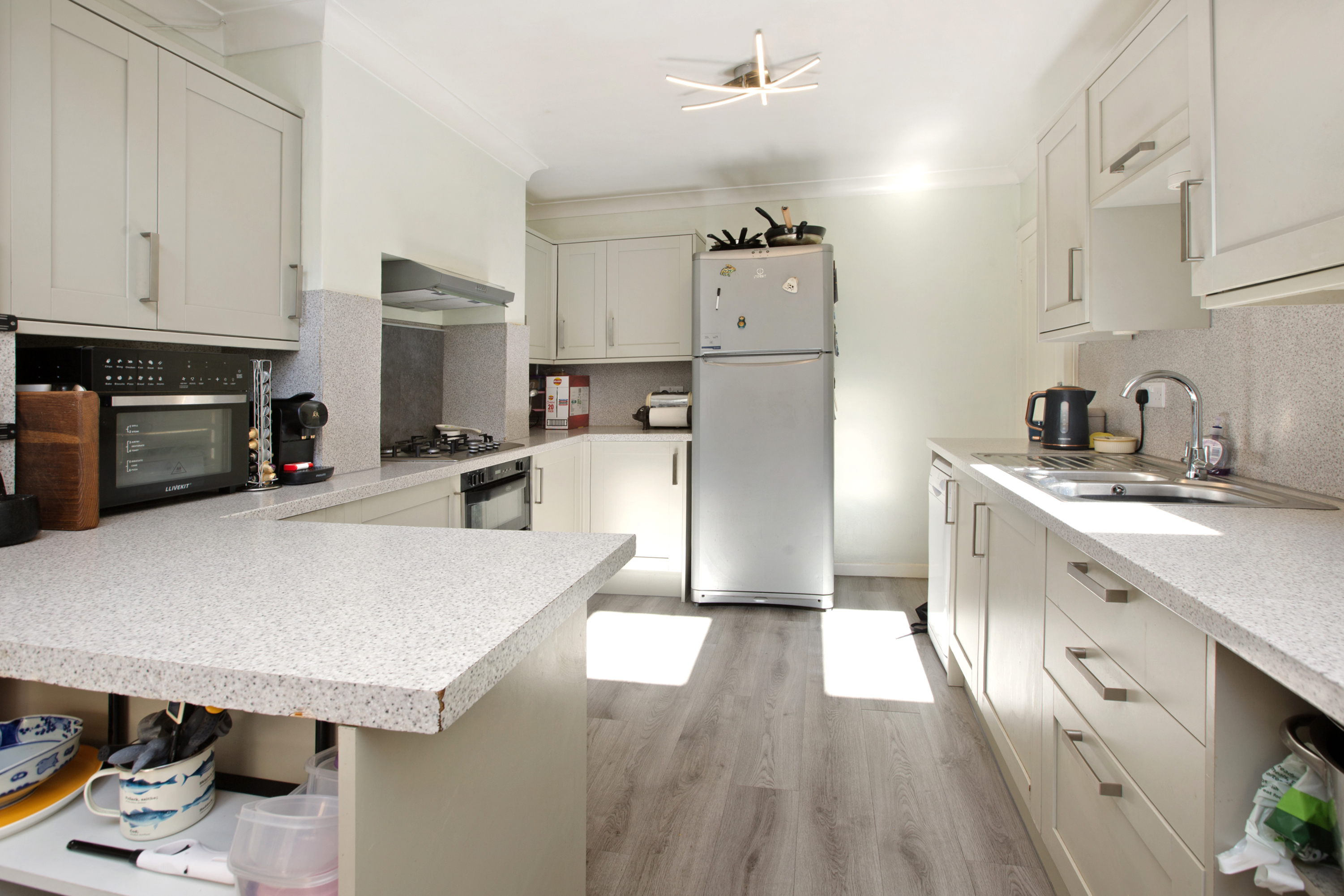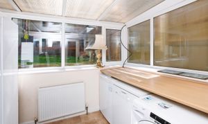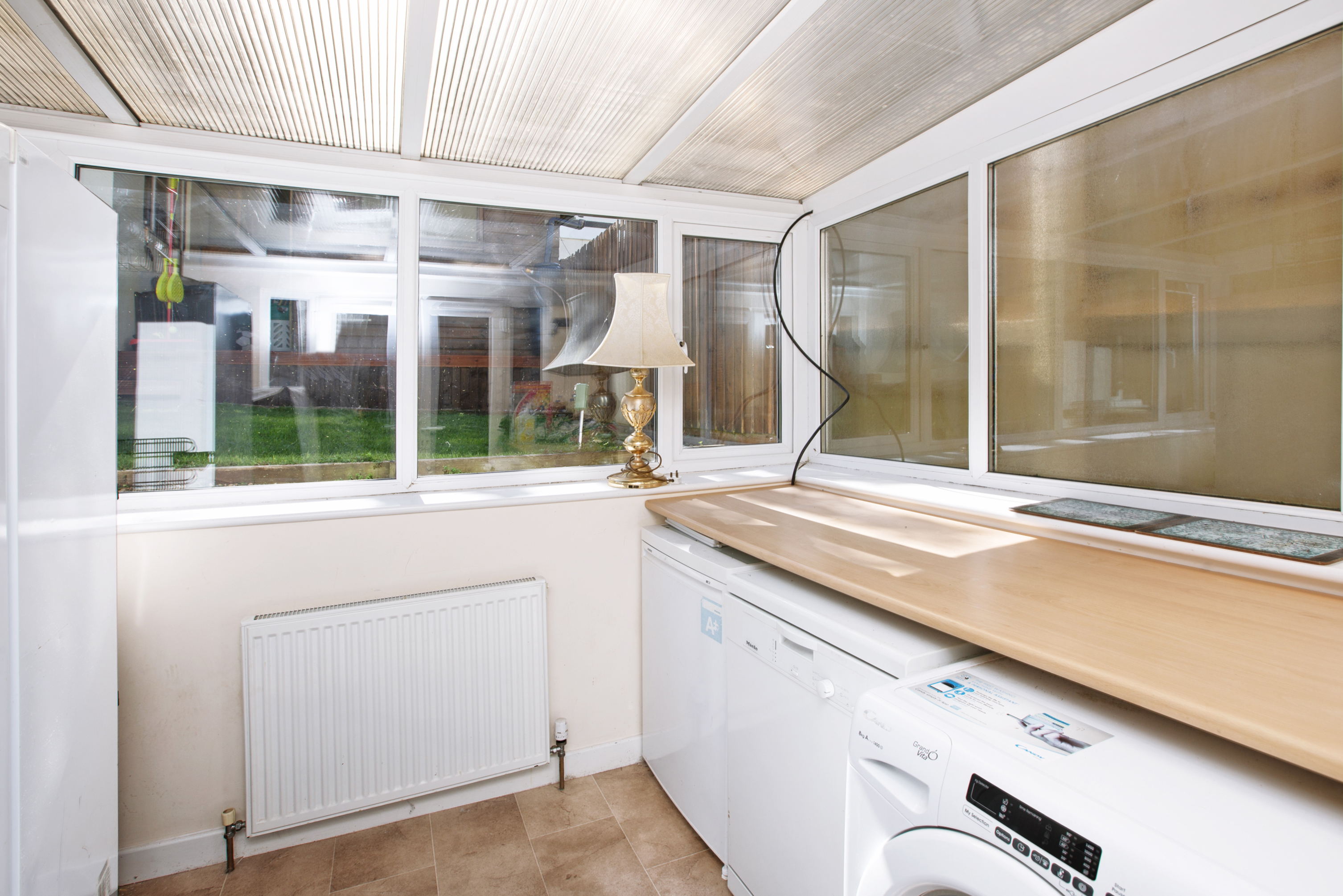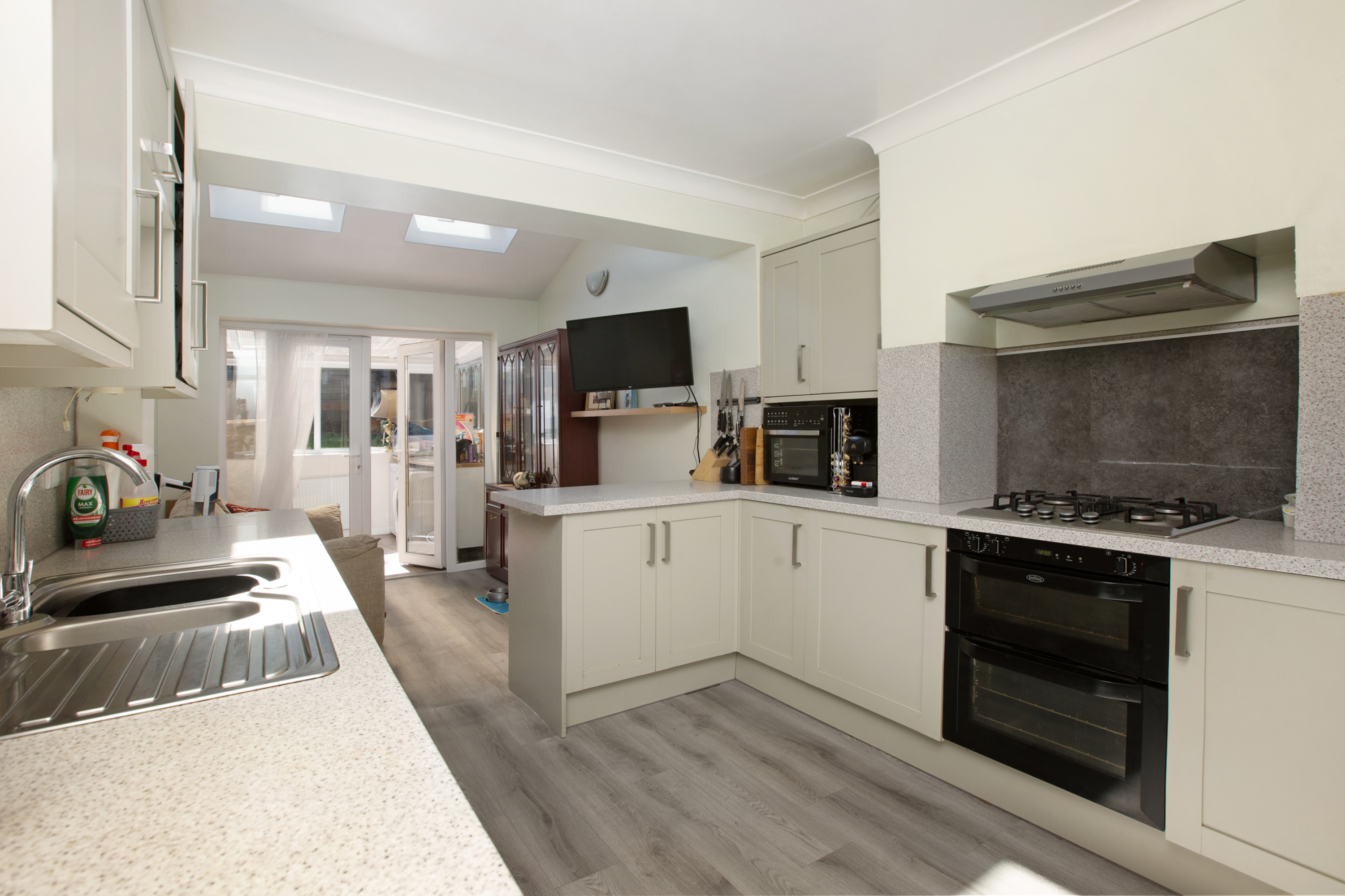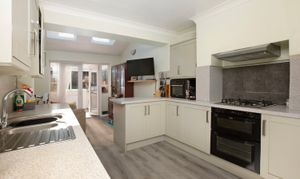 The heart of the home is the kitchen/dining room, where a range of cream wall and base units is complemented by elegant white-flecked worktops. The space is well-equipped with a built-in oven, gas hob, and extractor fan, plus plumbing for a dishwasher and ample room for a fridge/freezer. Overhead skylights flood the dining area with natural light, and doors open into a bright conservatory, perfect for morning coffee or relaxed entertaining while enjoying views of the garden.