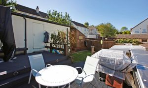 The enclosed rear garden is a true highlight: a generous lawn provides ample space for children to play or pets to roam, and a decked patio area invites alfresco dining or summer gatherings. A door from the garden leads into the rear of the garage and a useful outbuilding, both offering valuable storage or workshop potential.