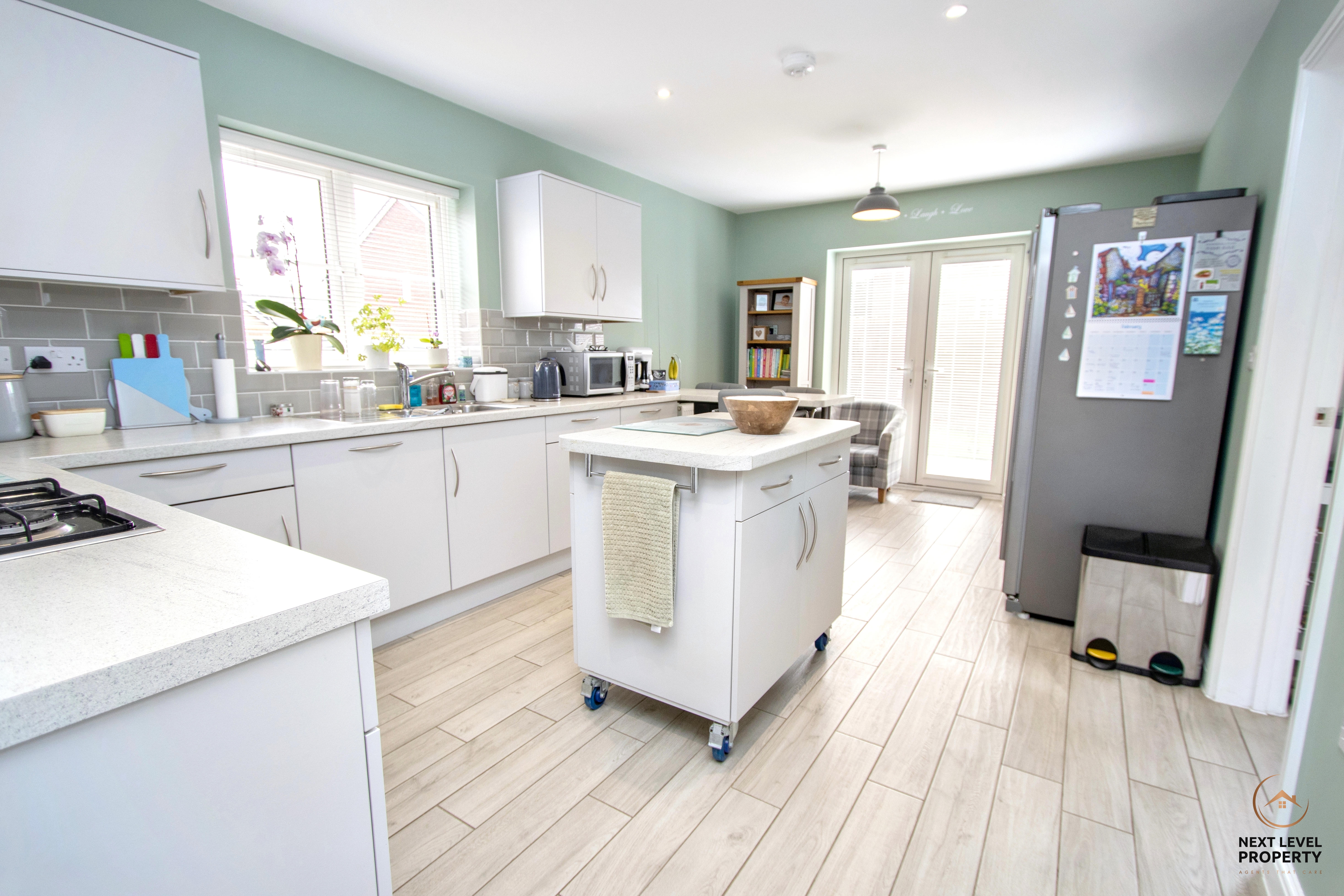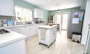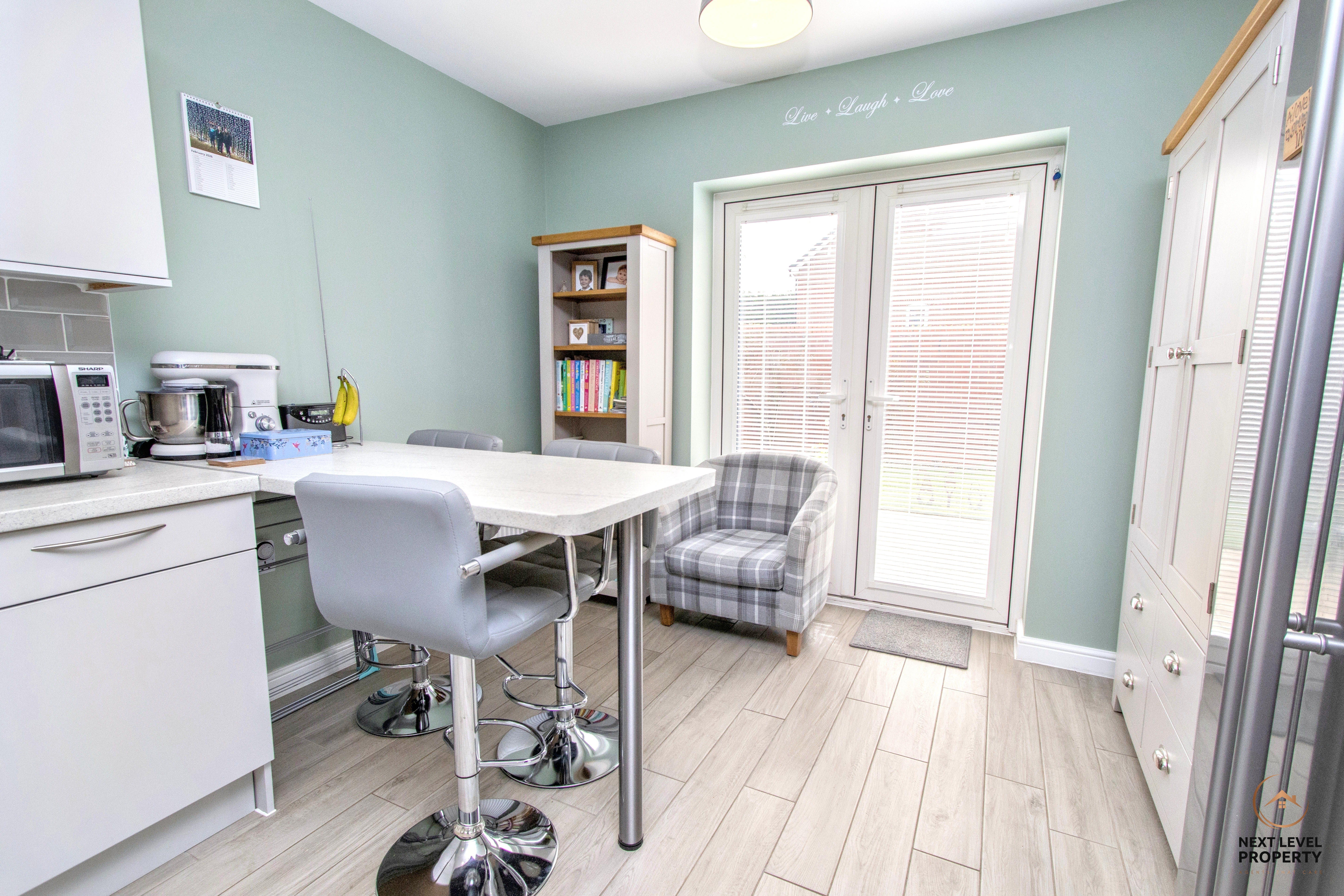 A bright and modern kitchen designed very much with everyday living in mind. Fitted with a range of wall and base units offering generous storage and drawer space, the room combines practicality with style. There is a built-in oven with gas hob and cooker hood over, along with an integrated dishwasher to keep the space sleek and uncluttered. A movable centre island provides additional preparation space and flexibility, while the fitted breakfast bar creates a natural spot for morning coffee or casual dining. A uPVC window to the side brings in natural light, and uPVC French doors open directly onto the garden — perfect for easy summer entertaining. A door leads conveniently through to the utility room, keeping the main kitchen area beautifully organised.