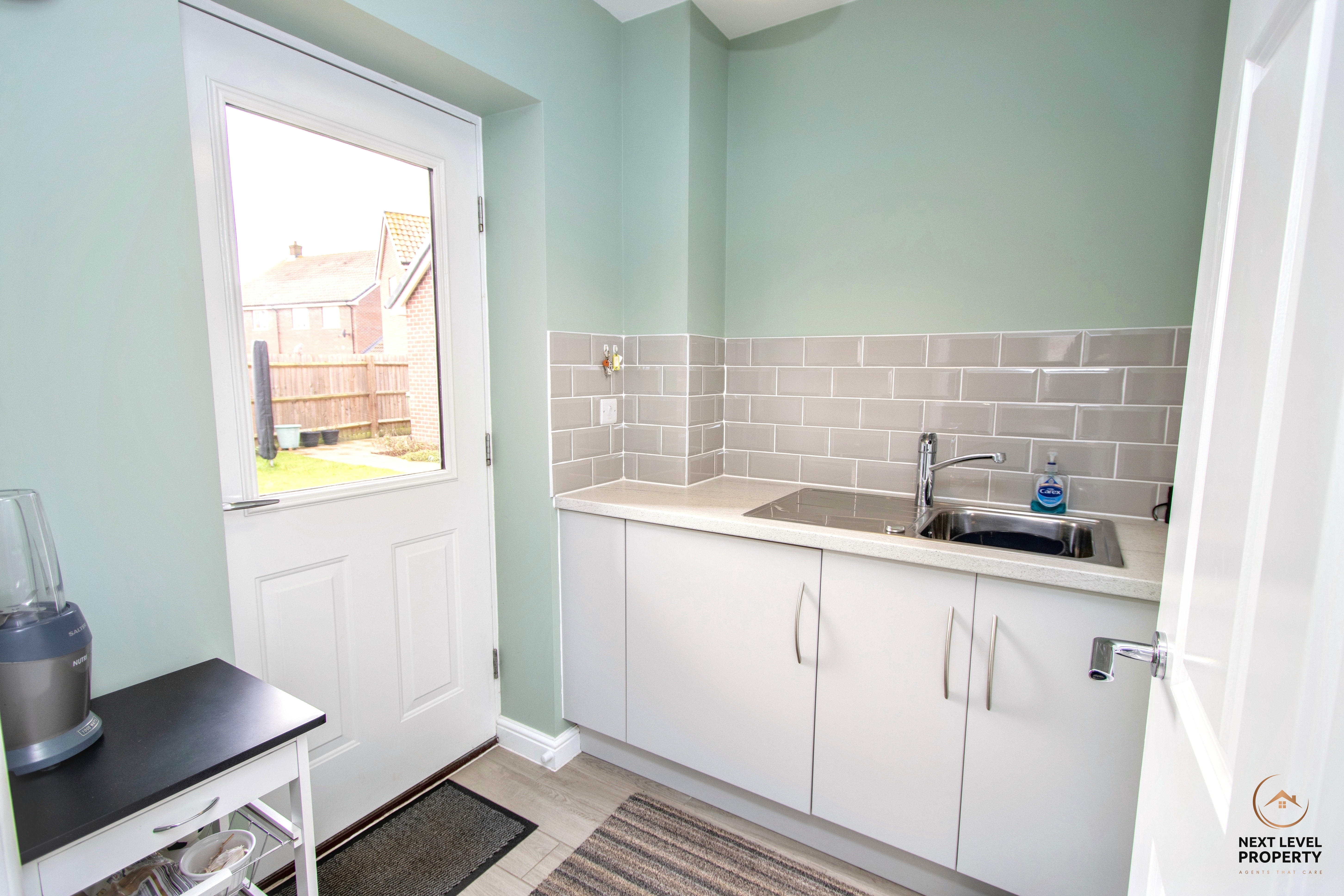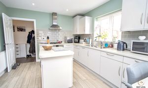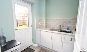 A practical and well-equipped utility space fitted with a range of matching cupboards and work surfaces, providing excellent additional storage. There is an inset sink with mixer tap and tiled splashbacks, along with an integrated washing machine to keep the area streamlined and uncluttered. A door leads directly out to the rear garden, ideal for muddy boots, pets or busy family life.