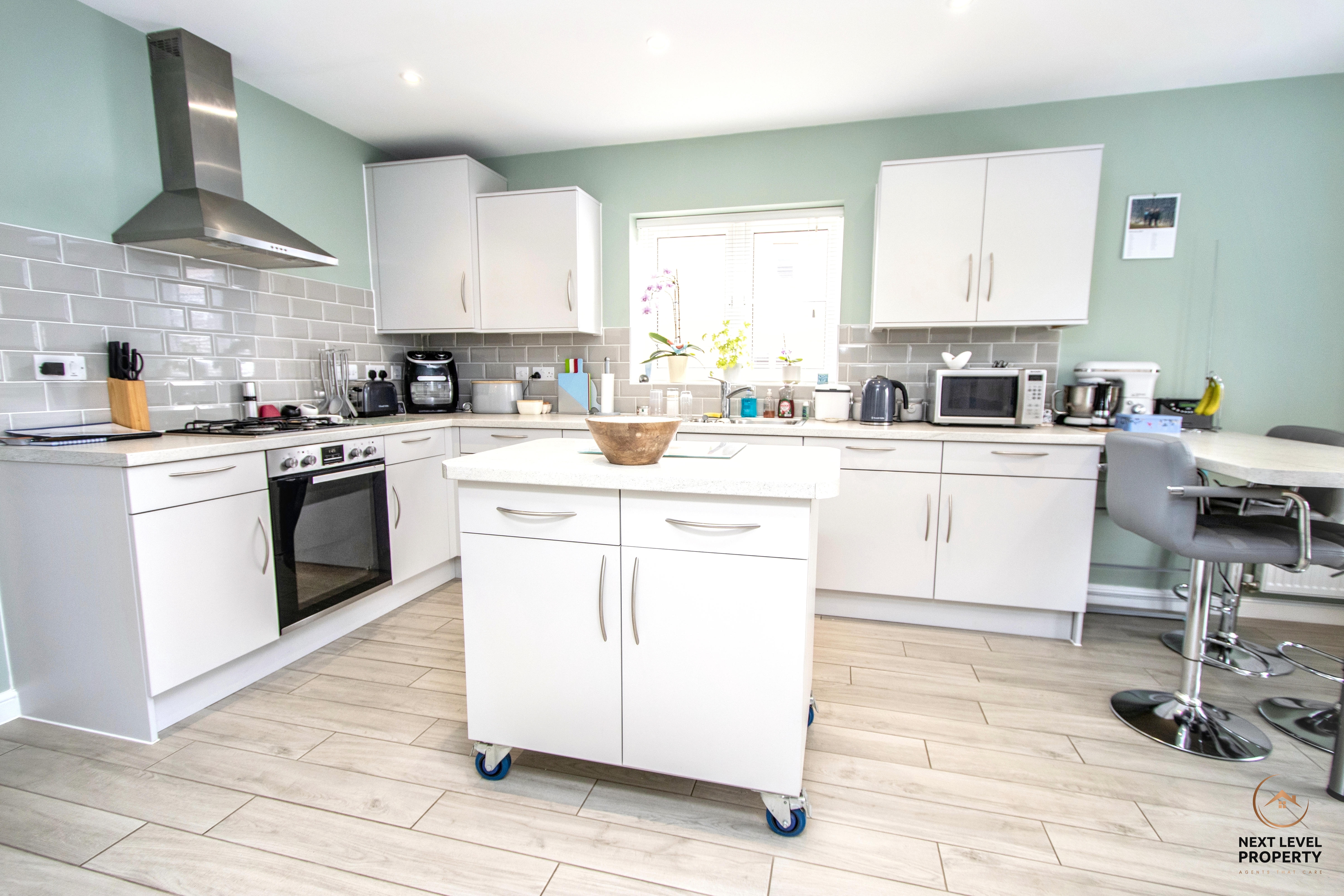 - Bright contemporary kitchen with island & integrated appliances