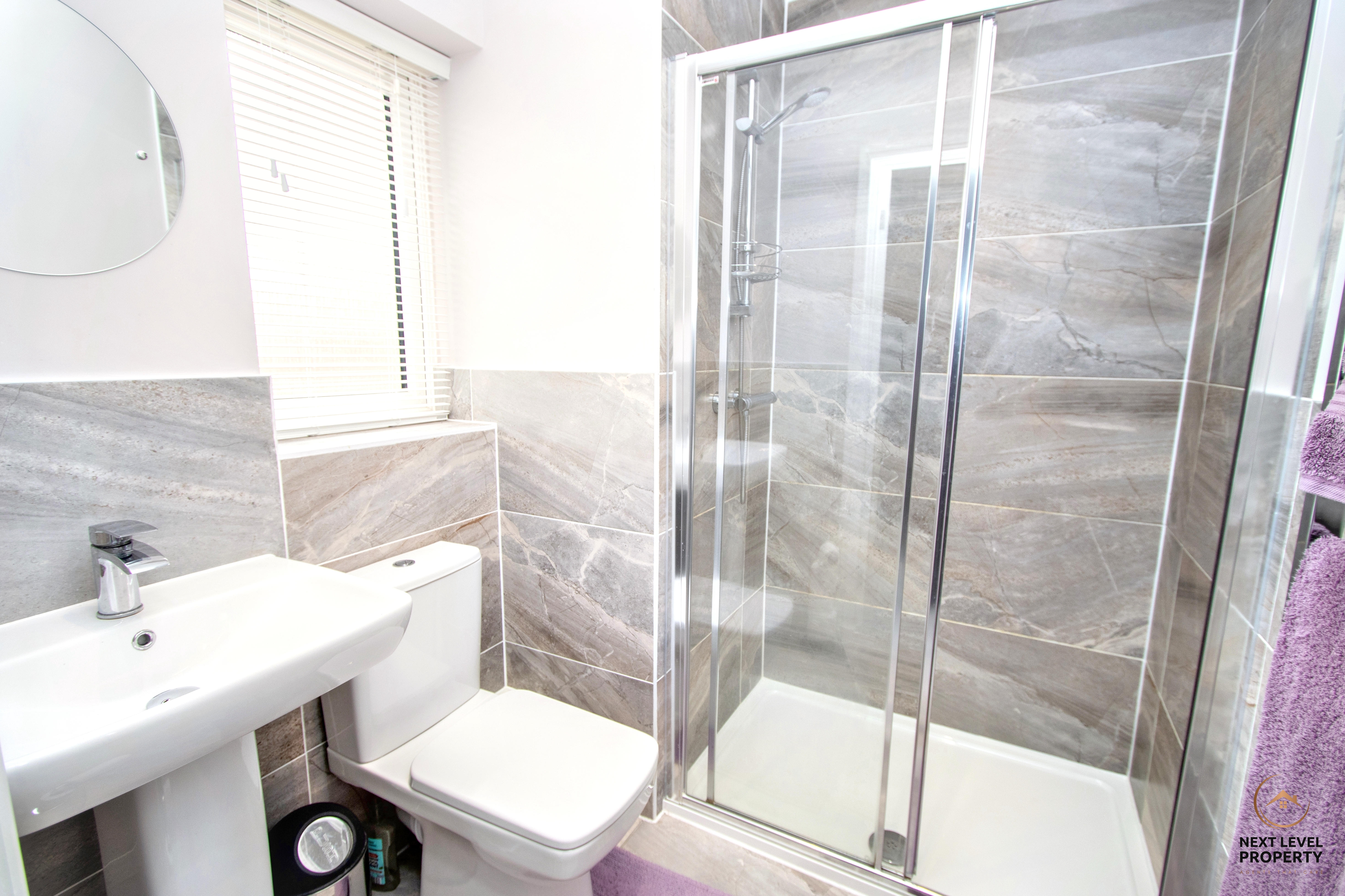 The en-suite is fitted with a modern white suite comprising a close-coupled WC, pedestal hand basin and a large shower cubicle with mains shower. Half-tiled walls and splashbacks create a clean and contemporary feel, while a heated towel rail adds a touch of comfort. A uPVC window to the rear allows natural light and ventilation, completing this practical and private addition to the principal bedroom.