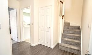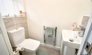 Conveniently positioned off the hallway, the ground floor cloakroom is fitted with a modern white suite comprising a close-coupled WC and pedestal hand basin, complemented by tiled splashbacks. A heated towel rail adds comfort, while the uPVC window to the front allows natural light to brighten the space.