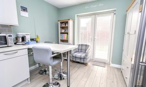 A comfortable and generously proportioned living space designed for both everyday family life and entertaining. There is ample room for a full dining table and chairs alongside substantial lounge furniture, creating a natural area to relax and gather. A uPVC window to the front allows light to pour in, while uPVC French doors to the rear open directly onto the garden — perfect for summer evenings, weekend barbecues and seamless indoor-outdoor living.