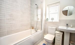 The family bathroom is fitted with a modern white suite comprising a bath with glass screen and shower taps over, pedestal hand basin and close-coupled WC. Tiled splashbacks and half-tiled walls create a clean, low-maintenance finish, while a uPVC window to the front allows natural light to brighten the space. An extractor fan adds further practicality, making this a well-balanced and functional family bathroom.