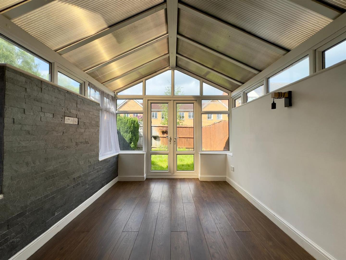 A welcoming hallway leads to a fitted kitchen at the front, a ground-floor W.C., and a full-width living room opening into a conservatory that overlooks the rear garden - great extra space for dining or play. Upstairs, three well-proportioned bedrooms are served by a family bathroom.