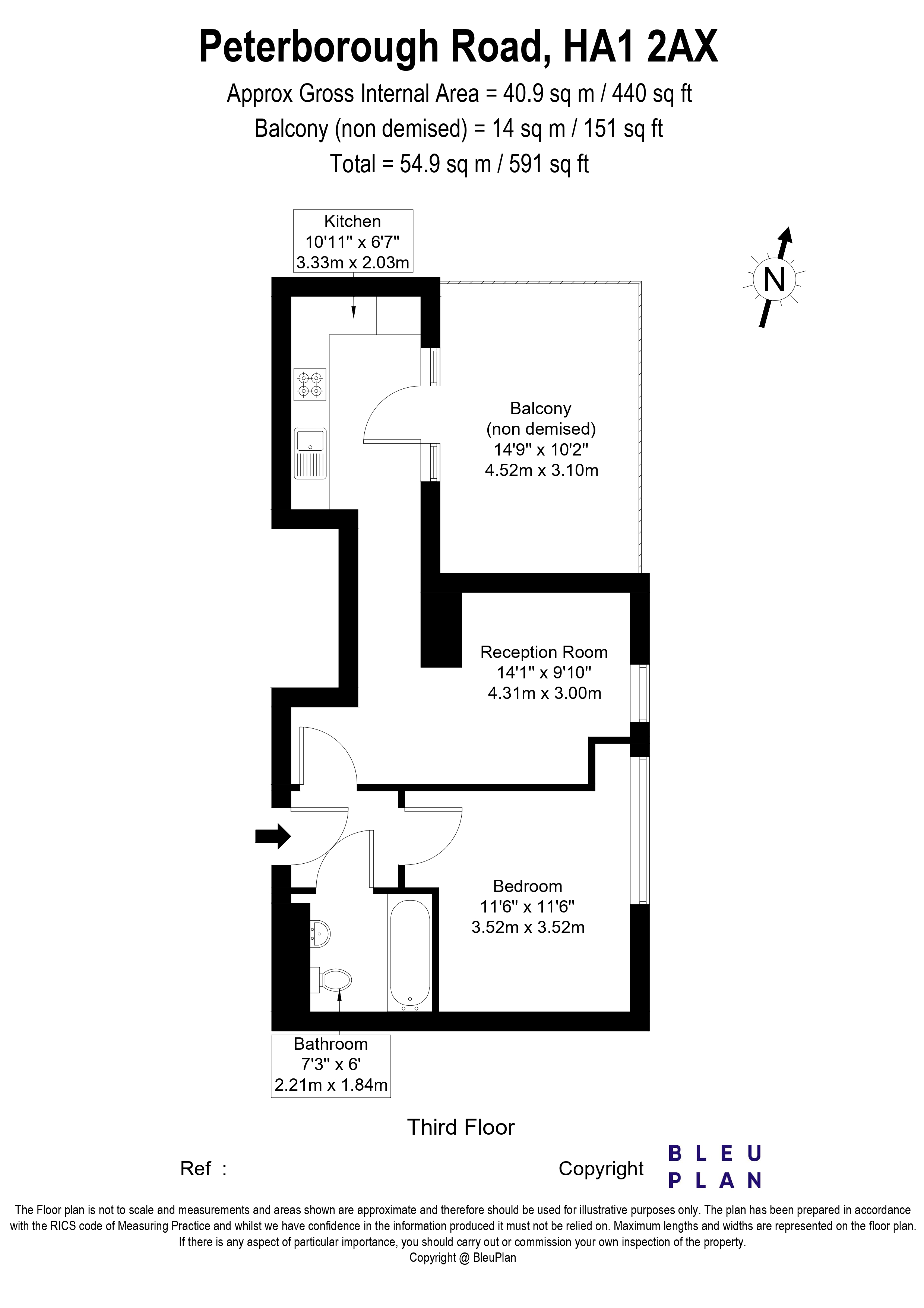 Situated on the third floor, the property offers approximately 440 sq. ft of internal living space, comprising a bright reception room, separate fitted kitchen, double bedroom and a modern bathroom.